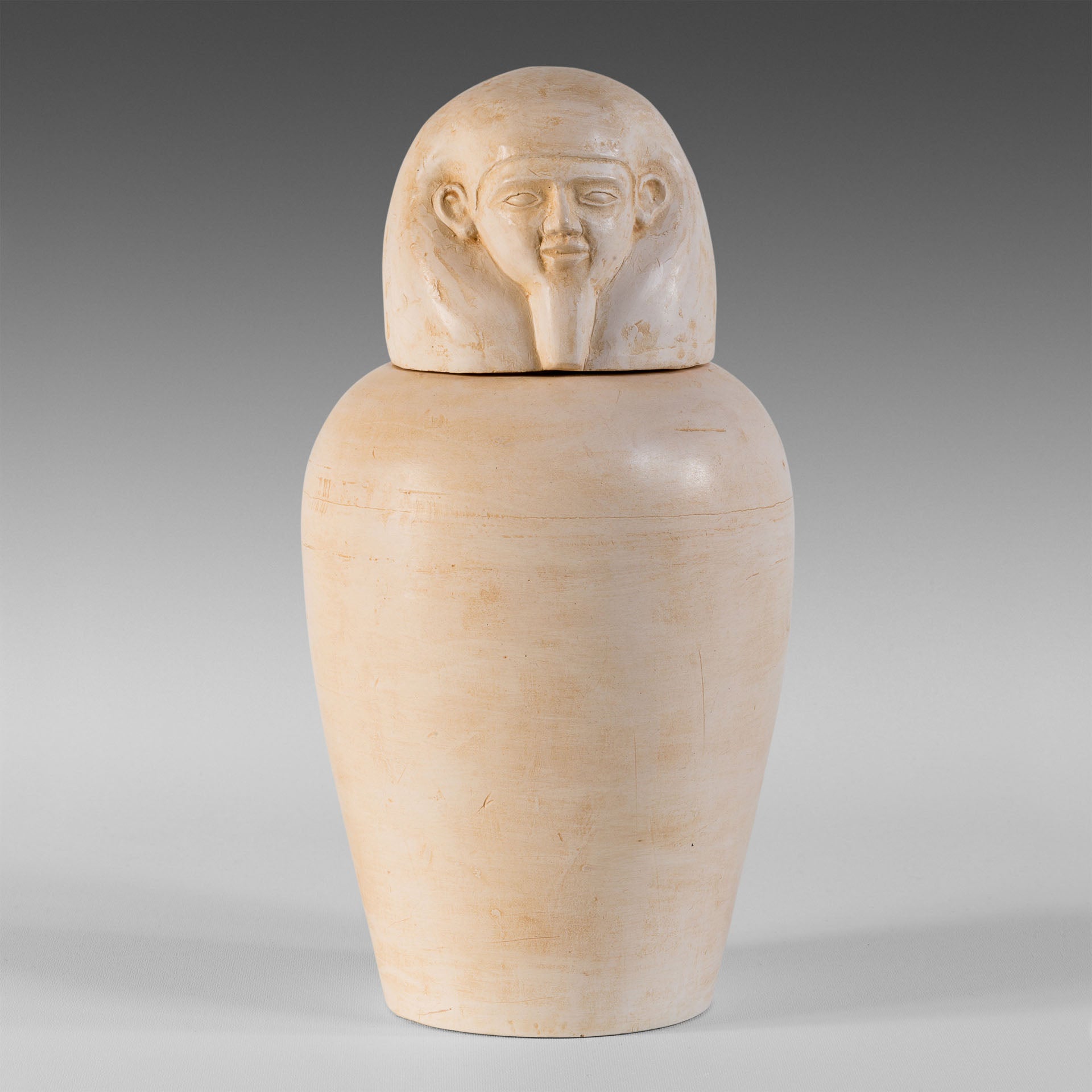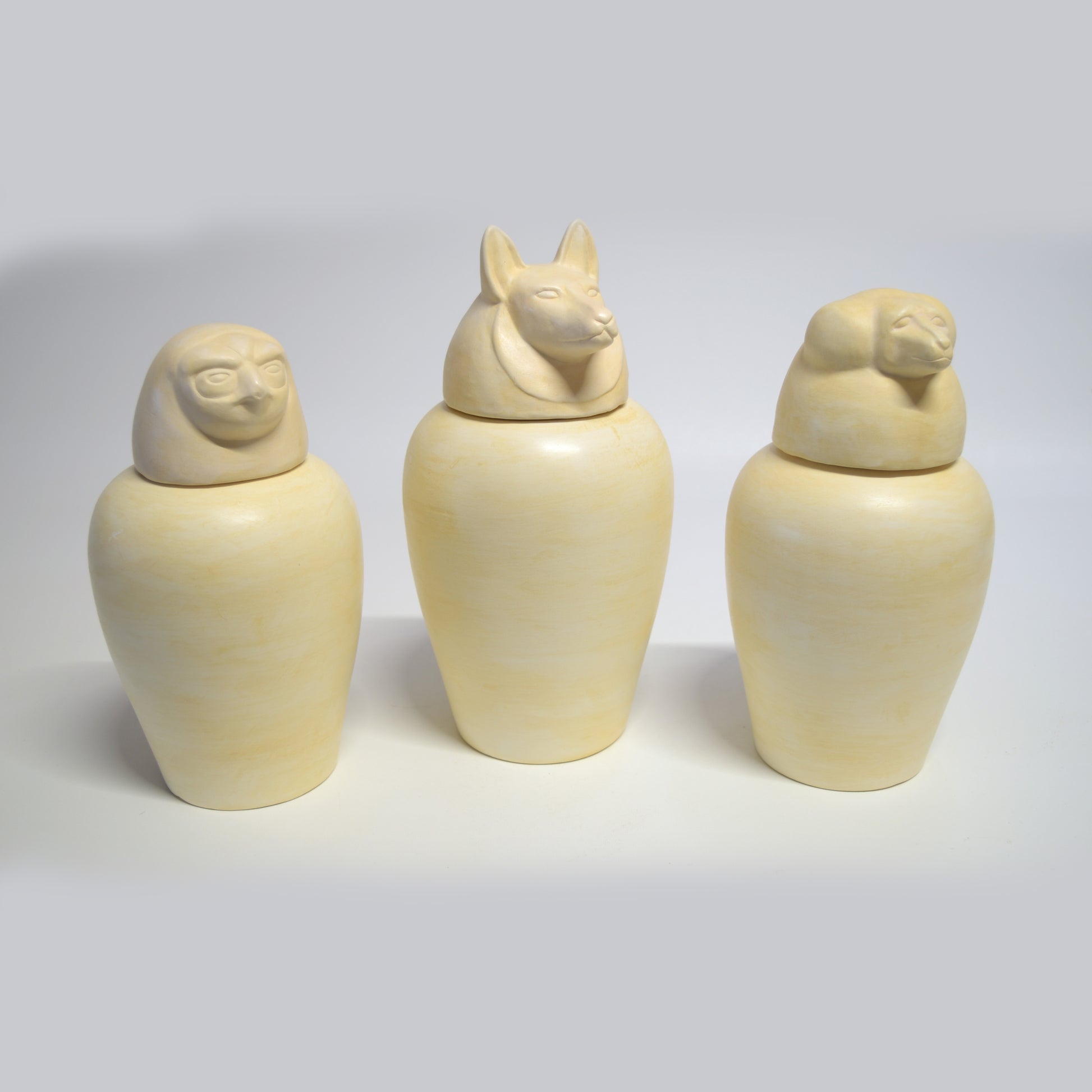 Celles-ci étaient confiées et protégées par les quatre fils d’Horus, dont les têtes décoraient le plus souvent les couvercles : Amset, à tête humaine (d’où le nom d’aneth, plante réputée pour ses propriétés de conservation) veille sur l’estomac, Hapi à tête de babouin pour les intestins, Douamoutef ressemble à un chien et protège les poumons, Qebekhsenouf à tête de faucon, le foie.