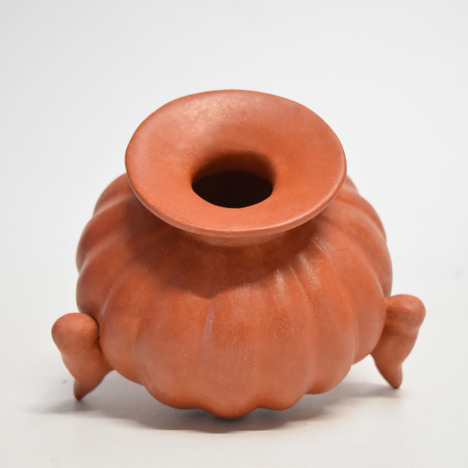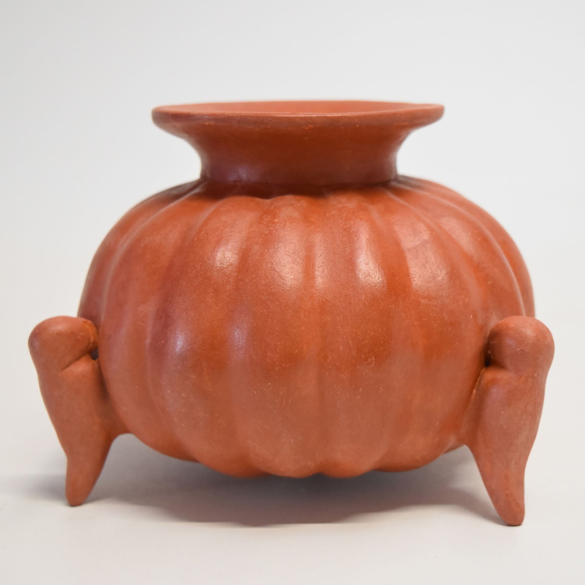 Les vases ronds à trois pieds sont caractéristiques de l'art de Colima, qui met en avant des récipients aux formes épurées, souvent inspirées de la nature, comme c'est le cas ici avec une citrouille.
