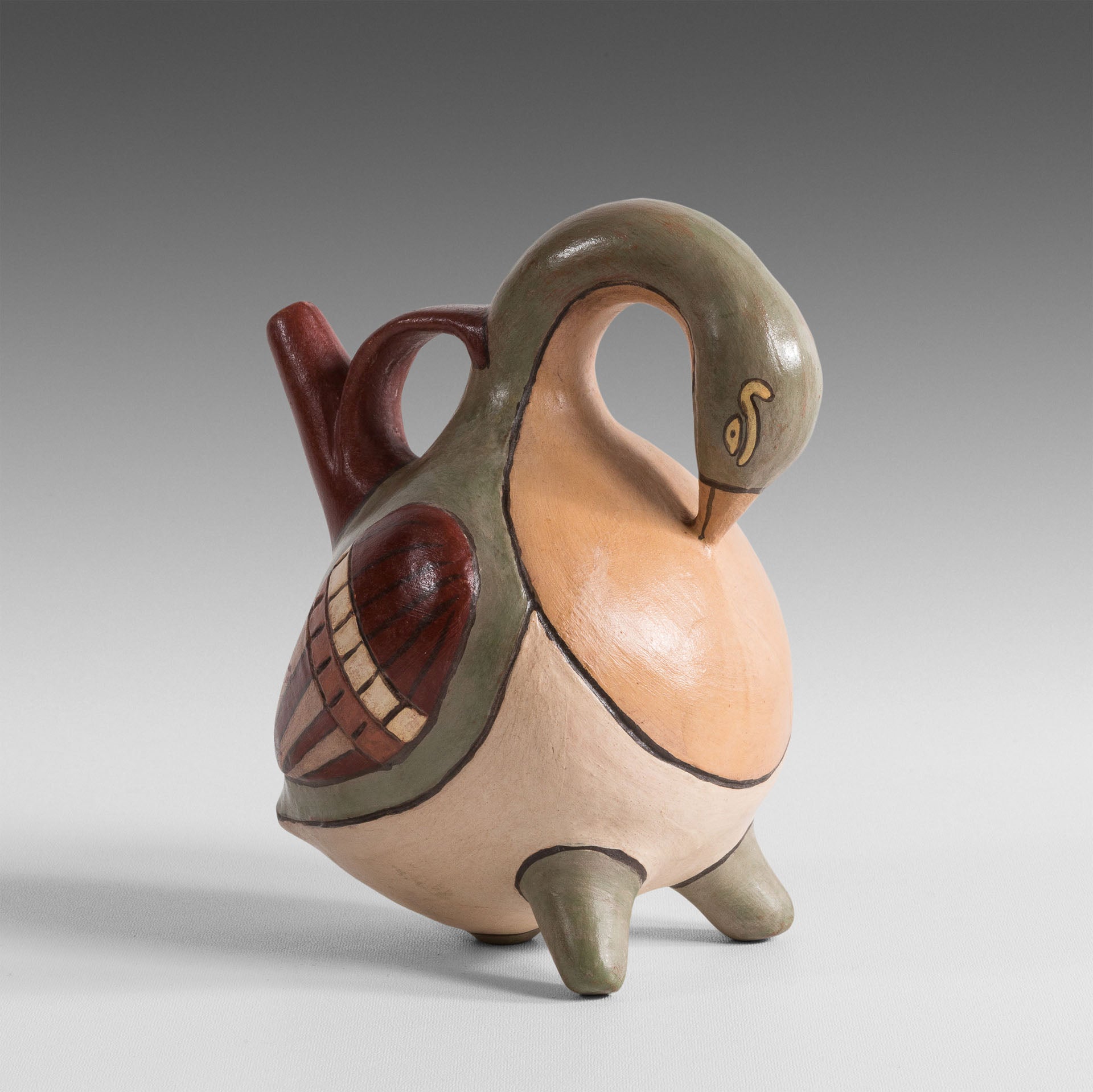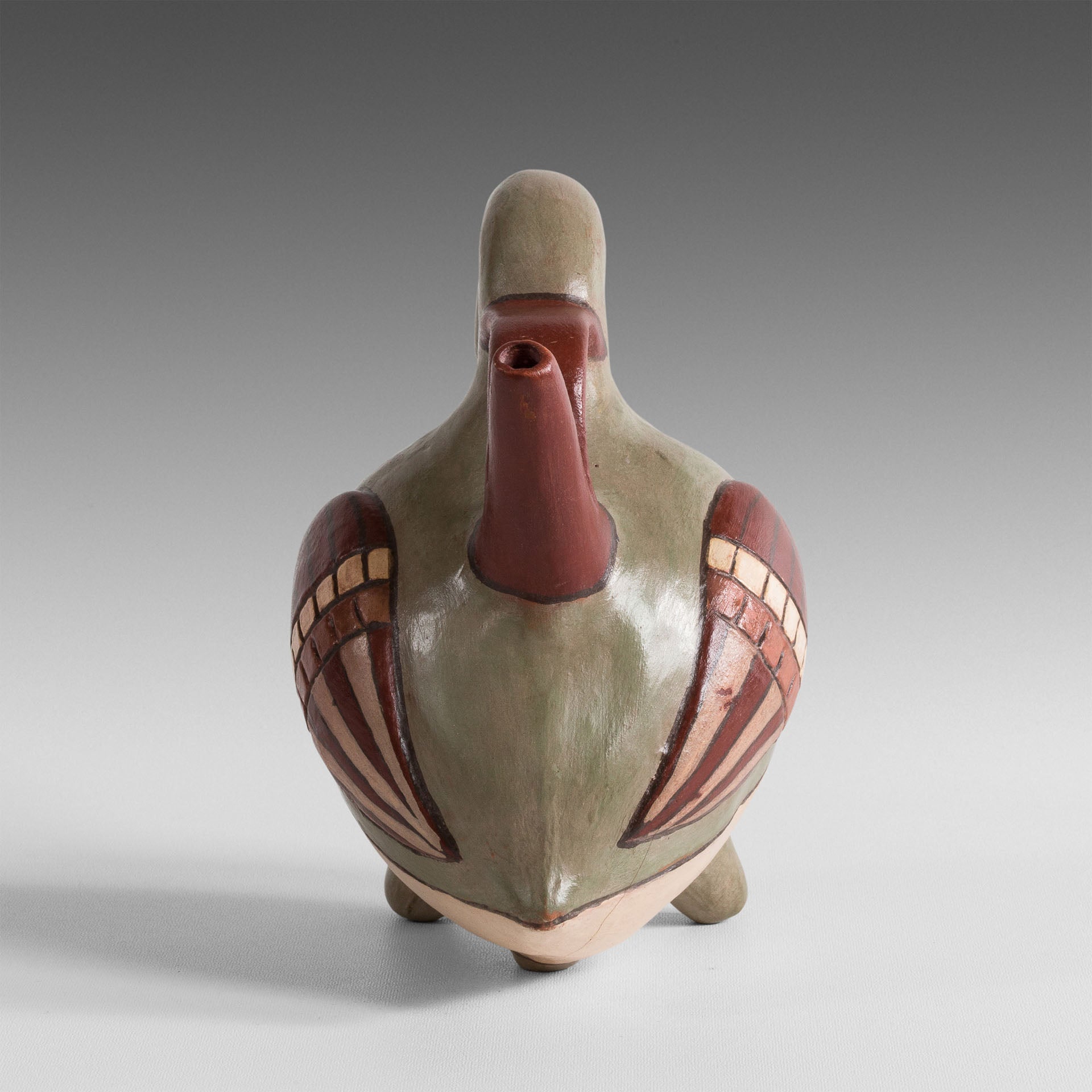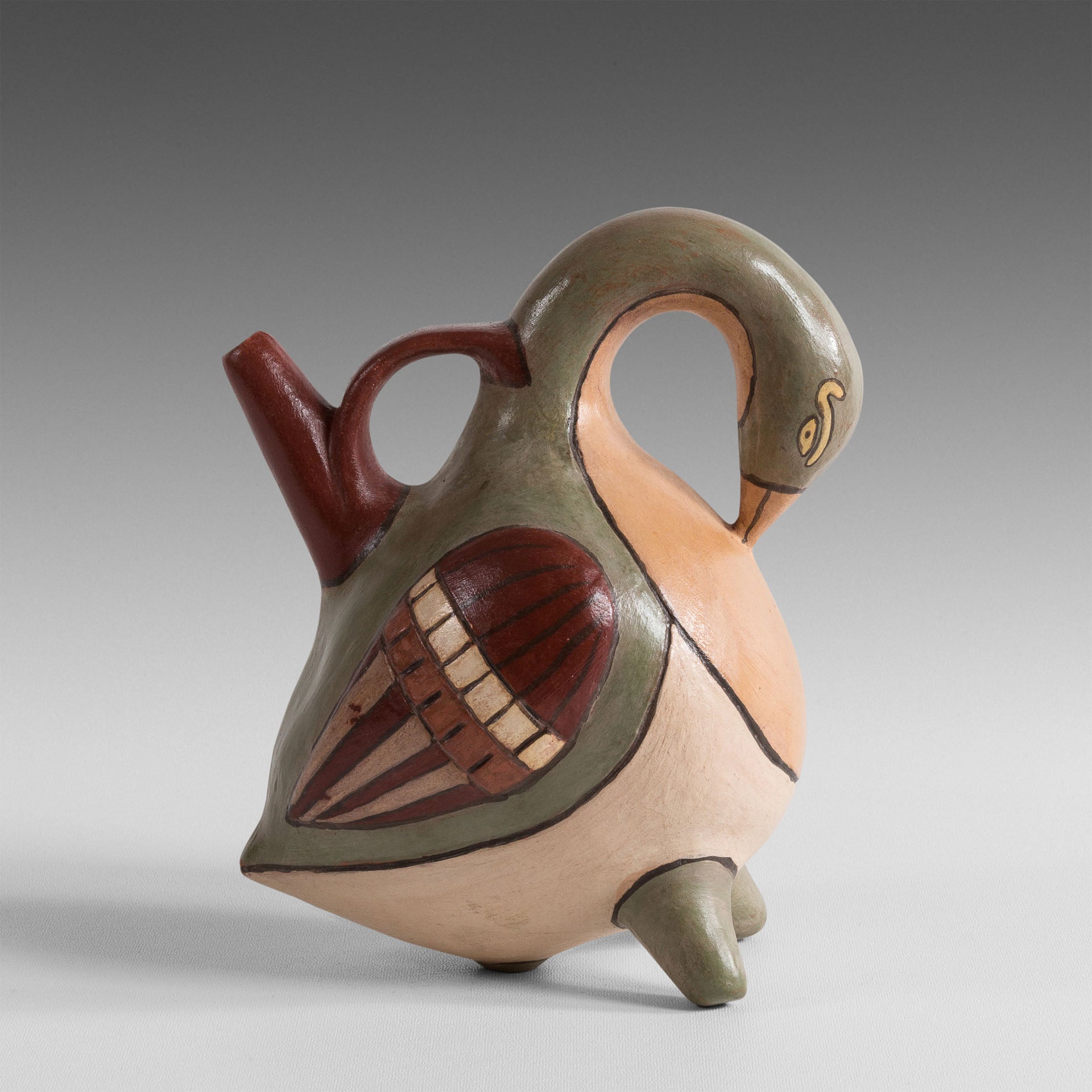 Le peuple Nazca est connu pour leurs immenses dessins façonnés avec des monticules de pierres visibles uniquement du ciel sur un plateau éponyme dans les Andes. Mais ils nous ont aussi laissé dans leurs tombes de nombreux objets de la vie quotidienne, des tissus, des bijoux, et surtout des céramiques. Ceux-ci sont reconnaissables aux motifs géométriques qui les ornent, ces motifs que l’on retrouve encore aujourd’hui dans les tissus péruviens. Le canard est, pour la plupart des peuplades des Andes, un oiseau sacré car leurs croyances voulaient qu’il soit l’intermédiaire entre les esprits célestes, terrestres, et aquatique. Cette céramique est harmonieuse et touchante par l’attitude de l’oiseau qui semble nettoyer ses plumes.