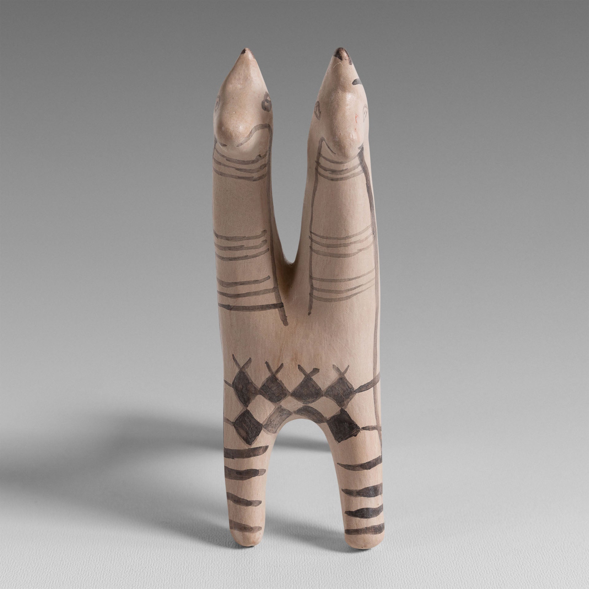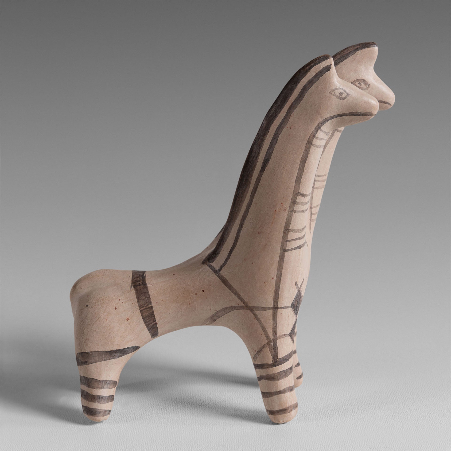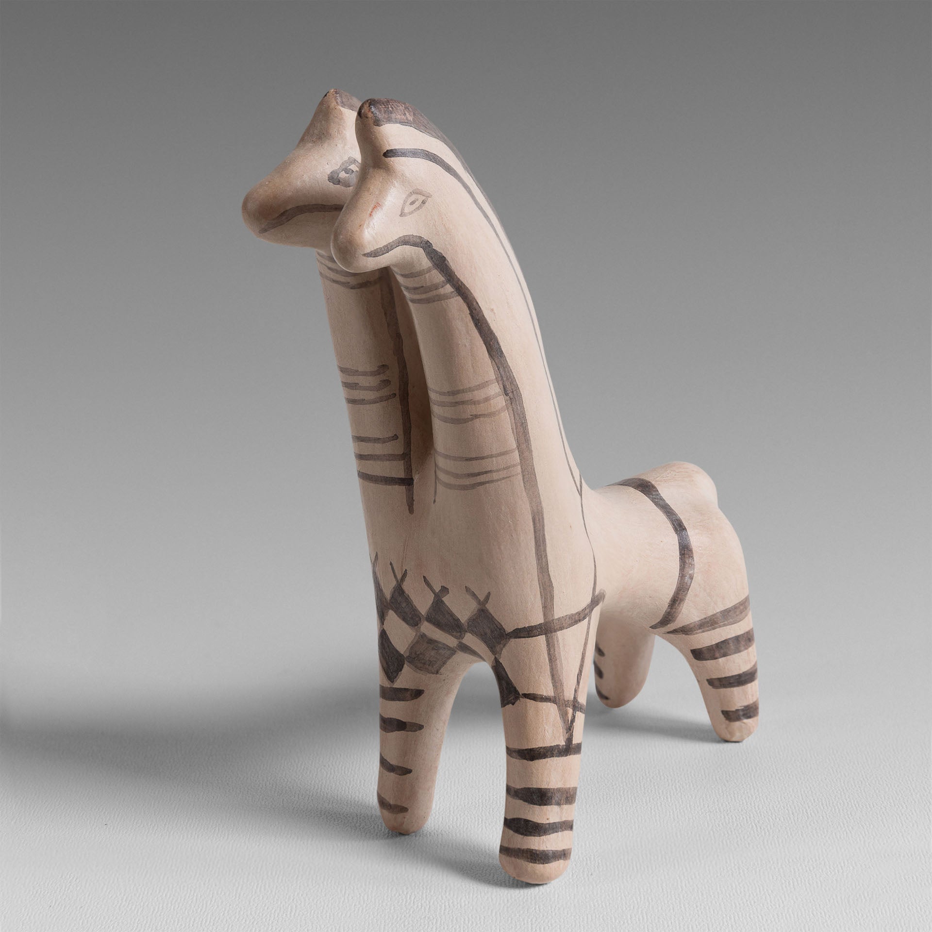 Ce cheval à deux têtes datant de l’époque de l’âge de bronze a été trouvé à Chypre. Contrairement à la Grèce de cette époque, cette île a conservé un certain nombre d’objets archéologiques qui permettent d’avoir des témoignages sur le développement des premières civilisations du bassin méditerranéen. Cette représentation particulière symbolise un couple de chevaux. Le cheval était très important pour les « chypriotes » à cause de son caractère noble et puissant. Cette figurine, comme d’autre associés à des chars ou chariot, a été trouvé dans des tombes d’enfants ce qui permet de croire que c’était probablement un jouet. Les motifs géométriques noirs sont caractéristiques de la céramique archaïque.