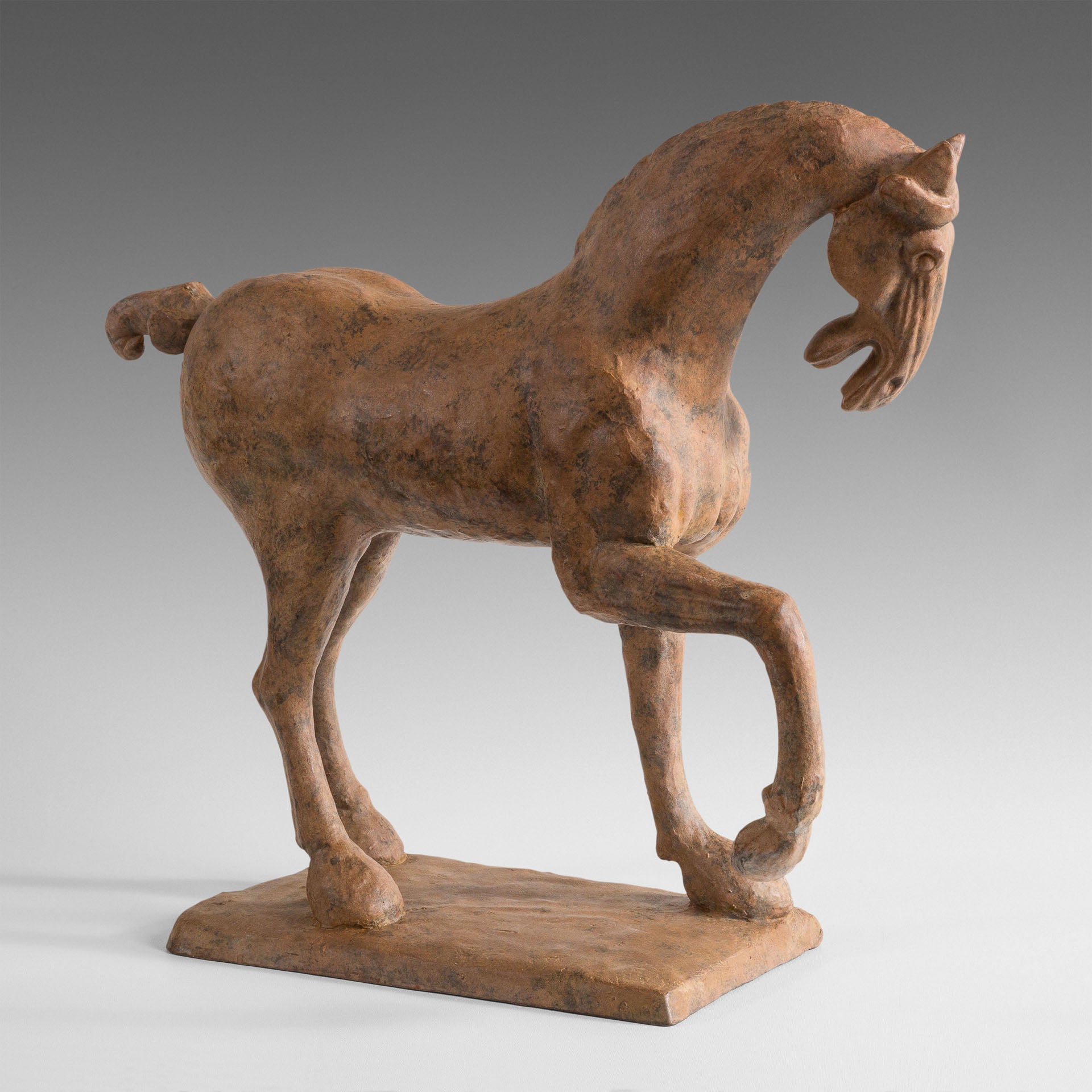 Le cheval est un thème éternel en Chine. Il a profondément marqué son histoire et sa culture dès le début du Ier siècle avant notre ère. Il est le symbole et l’instrument de conquête de l’Empire du Milieu. Ce cheval en terre cuite de la dynastie Han est un exemple parfait de la nouvelle race qu’ont recherché les empereurs Han pour protéger les frontières du nord et de l’ouest. Plus élancés et plus endurants, leur robe tachetée de roux les a rendus célèbres sous le surnom « les sueurs de sang ».