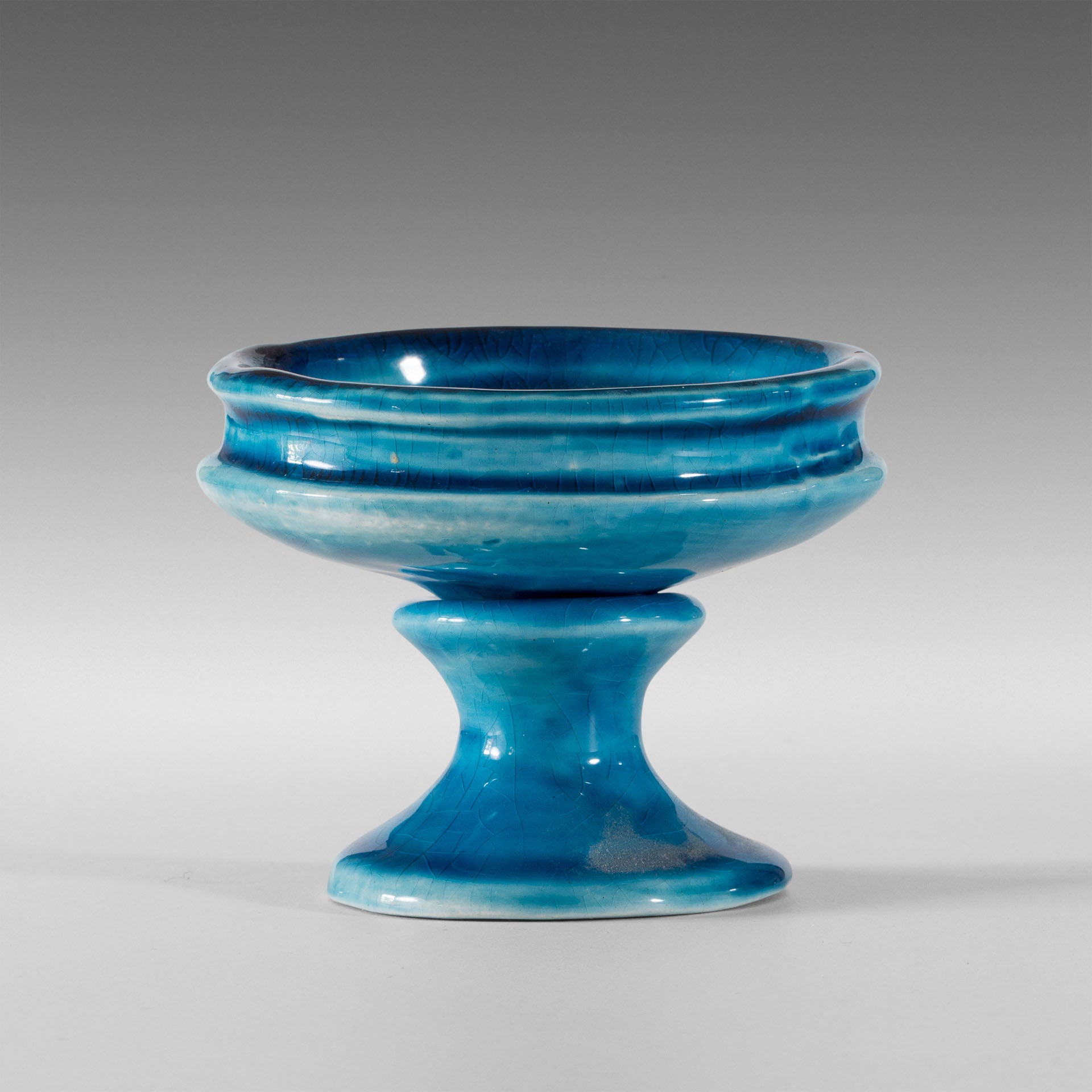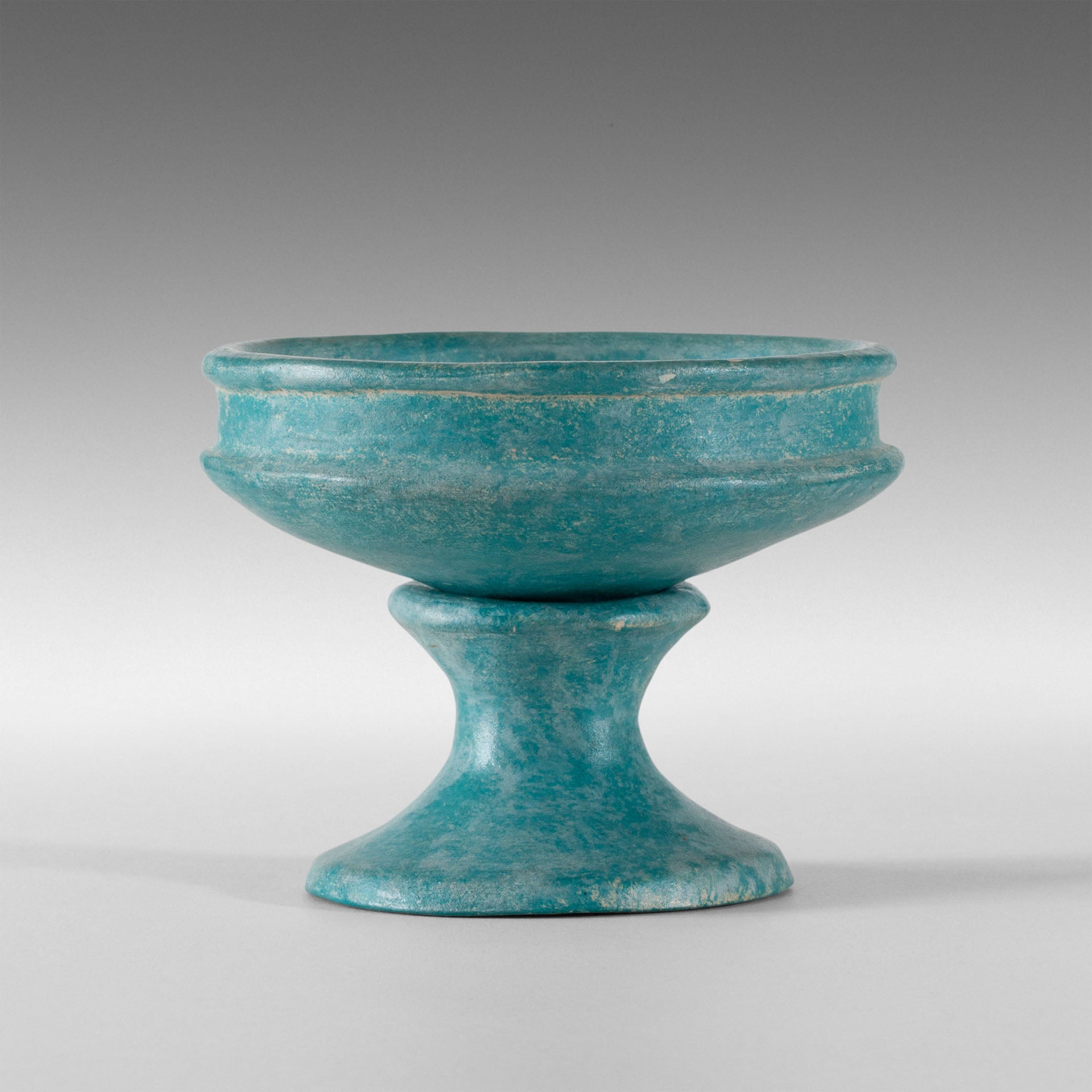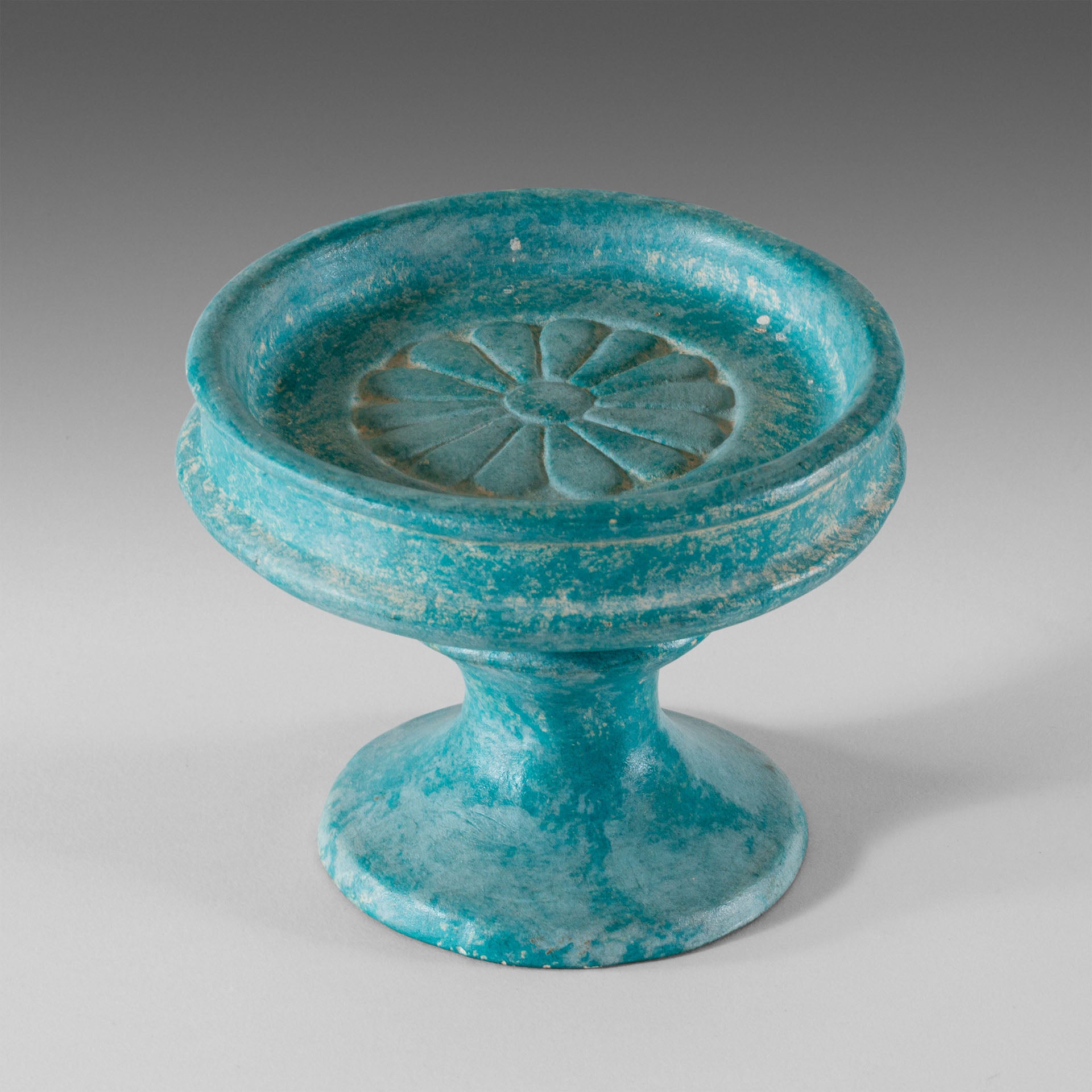 Cette coupelle originale, du fait de ses deux parties, date de l’époque d’Aménophis III. La forme de celle-ci est classique pour la vaisselle de bois ou d’albâtre chez les anciens égyptiens, dont on a retrouvé de nombreux exemples. Mais contrairement à celle-ci, les coupes sont toujours en une seule pièce. Nous retrouvons ces coupelles dans les scènes de banquets remplis d’onguents parfumés ce qui explique sa taille, chaque convive en ayant une à proximité. La couleur bleu turquoise et la rosette sont omniprésents dans la sculpture et les arts décoratifs sous Aménophis III. Cette « roue » utilisée très tôt dans l’art égyptien, par exemple sur les plafonds astronomiques, était un symbole céleste. Le motif s’est transformé en fleur sous le règne de ce roi. Il orne les seins de nombreuses sculptures de la reine Tiyi ainsi que celle de la déesse Sekhmet à tête de lionne, déesse tutélaire du roi.