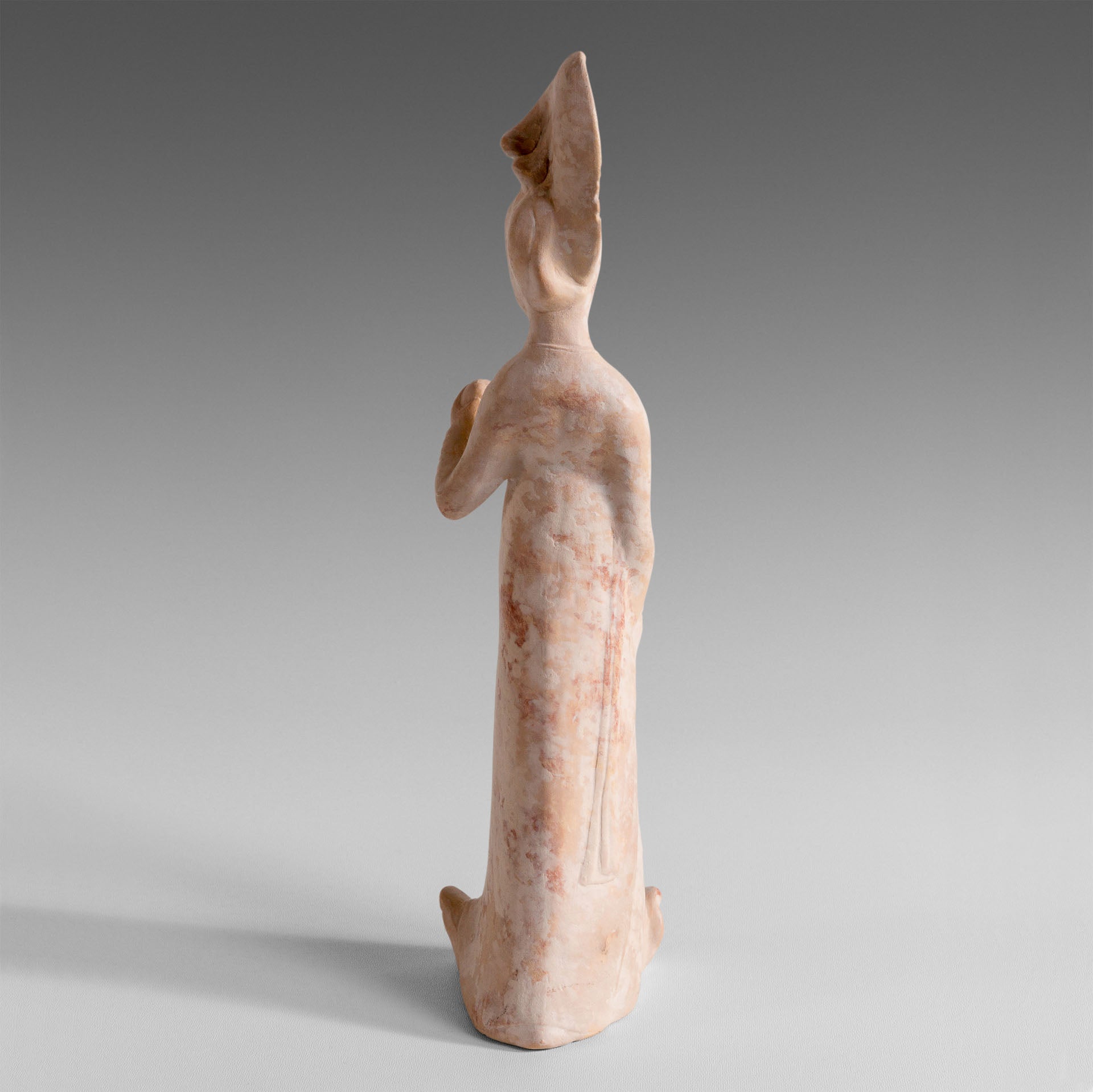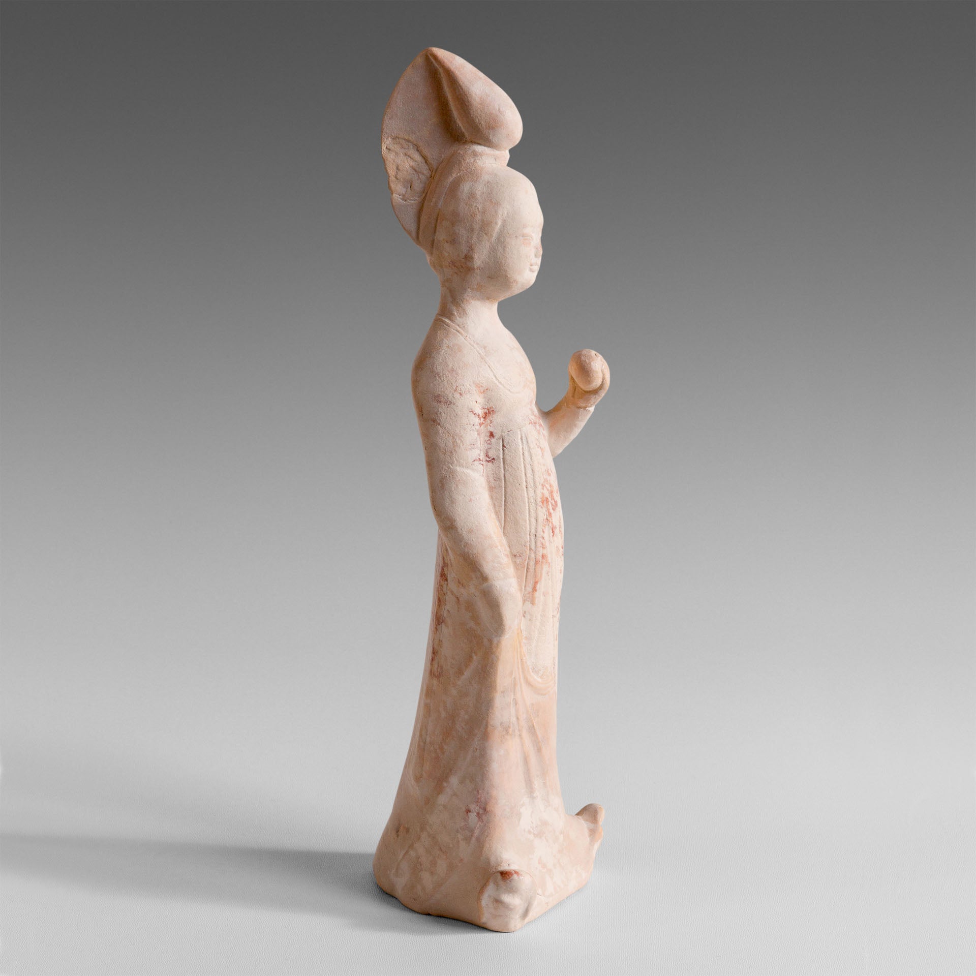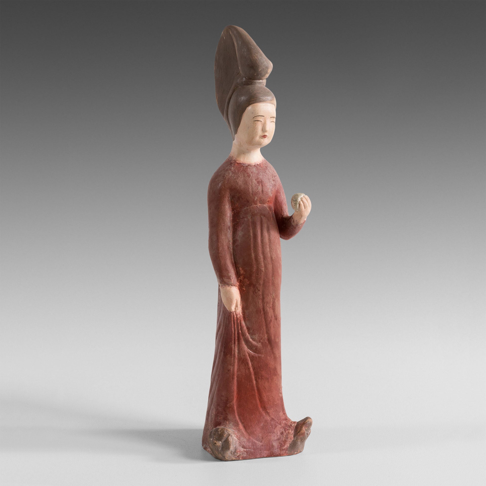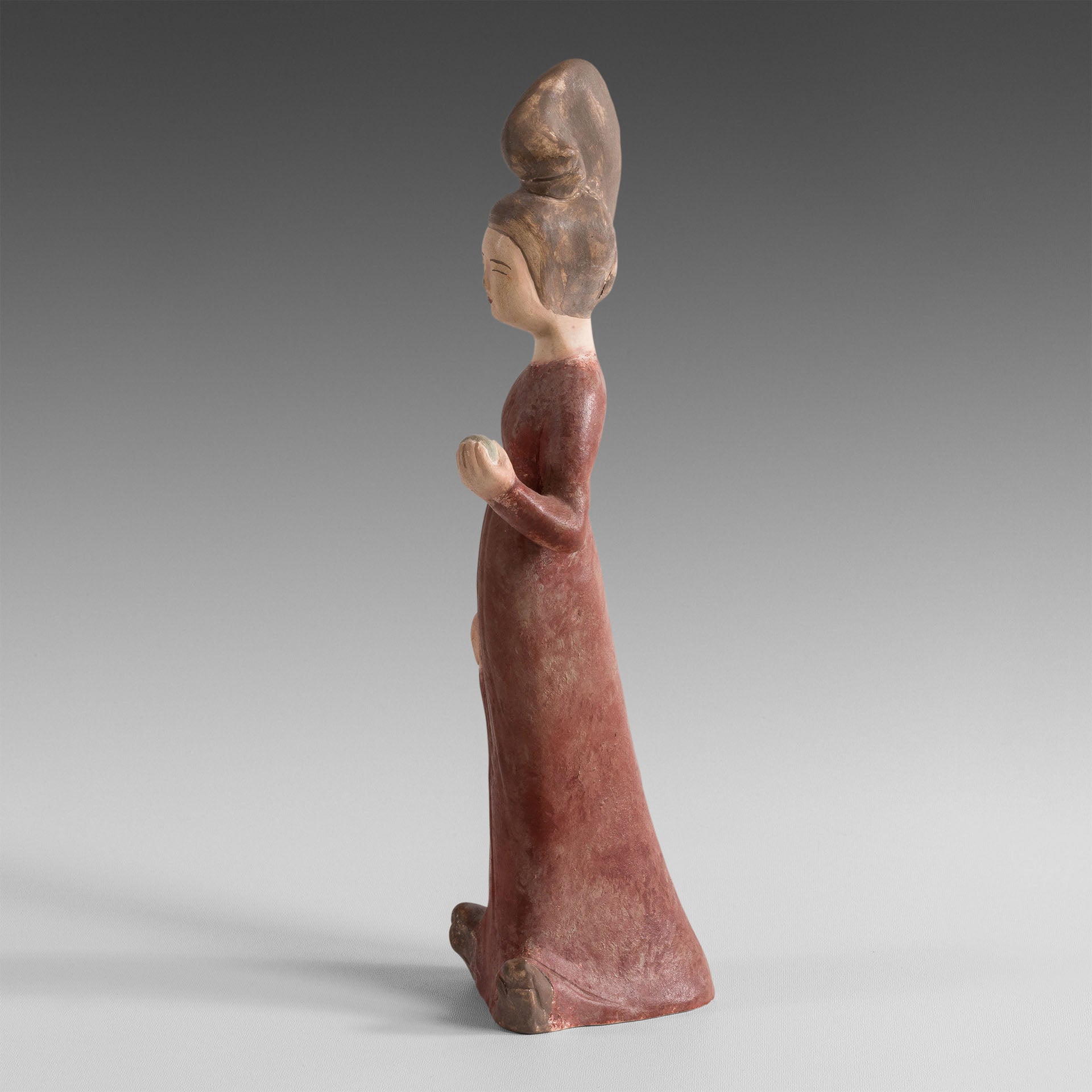 Ces statuettes étaient fabriquées en série à partir d’un moule unique pour le corps, seuls les têtes ou les accessoires étaient personnalisés. Pour cette "dame à la pomme", il existe un pendant qui tient un oiseau. Contrairement aux "Fat Ladies" de la période précédente, celle-ci est grande, svelte, avec une attitude altière, et un visage juvénile. Sa longue robe recouvre ses chaussons recourbés, laissant juste apparaître ses mains et son cou. Sa main droite remonte sa robe comme si elle allait s’avancer tandis que de l’autre elle tient une pomme. Cette posture ainsi que son cou frêle et son chignon en lame de sabre lui confère une fragilité mélangée à une élégance troublante, comme si elle voulait imposer sa beauté.