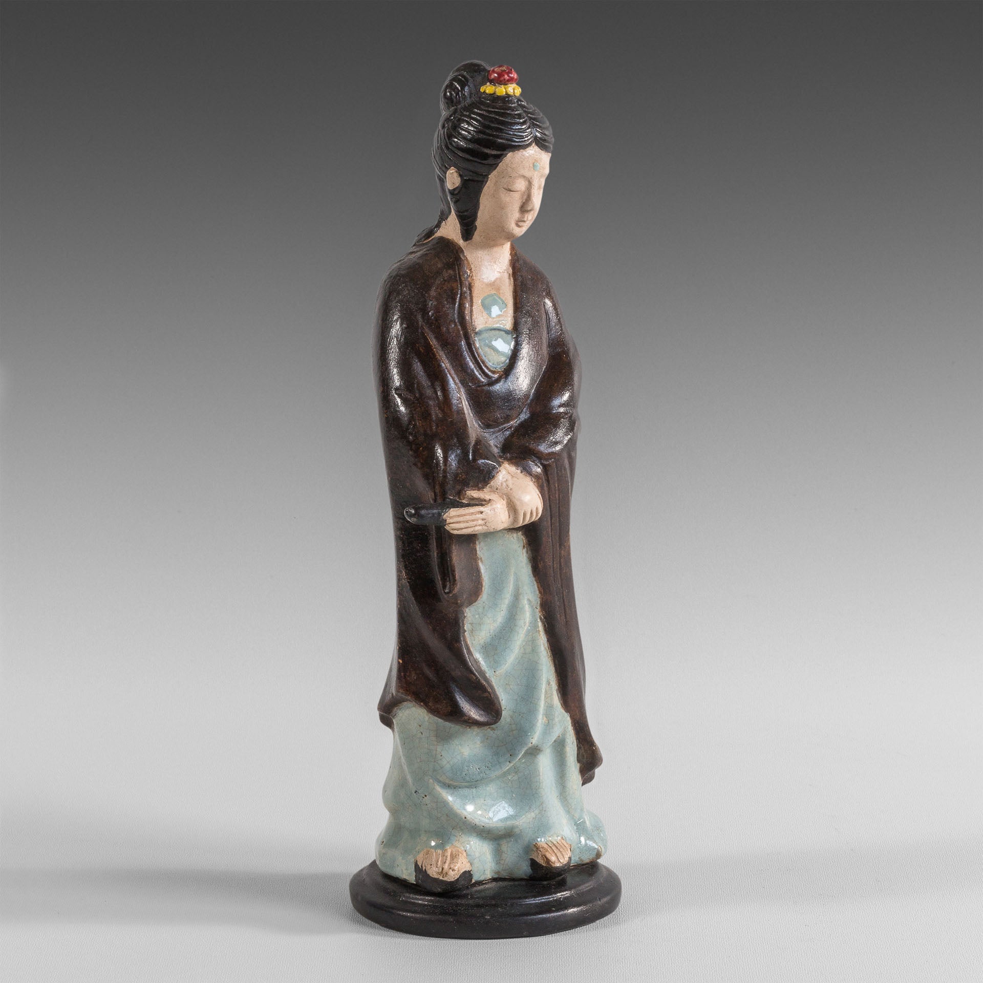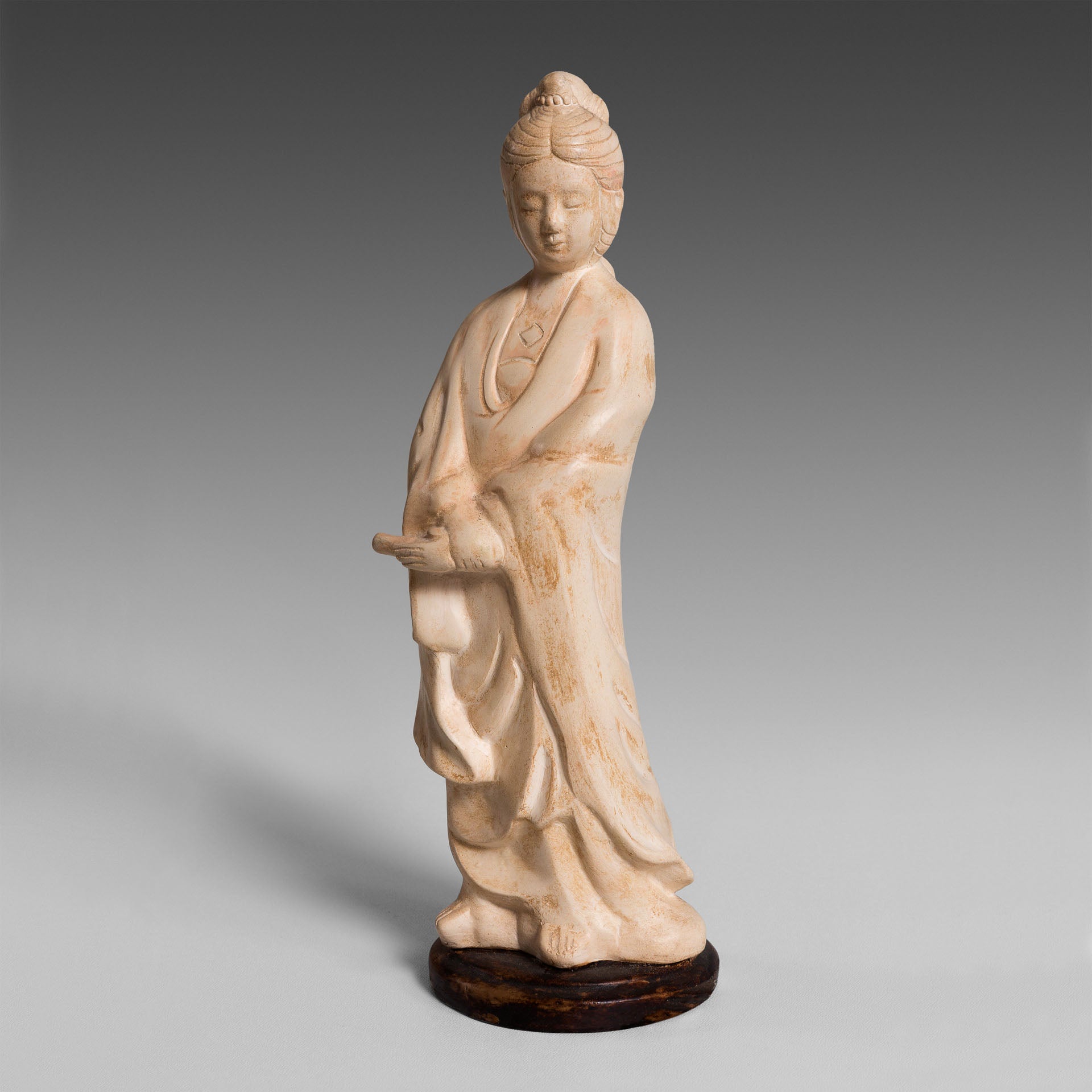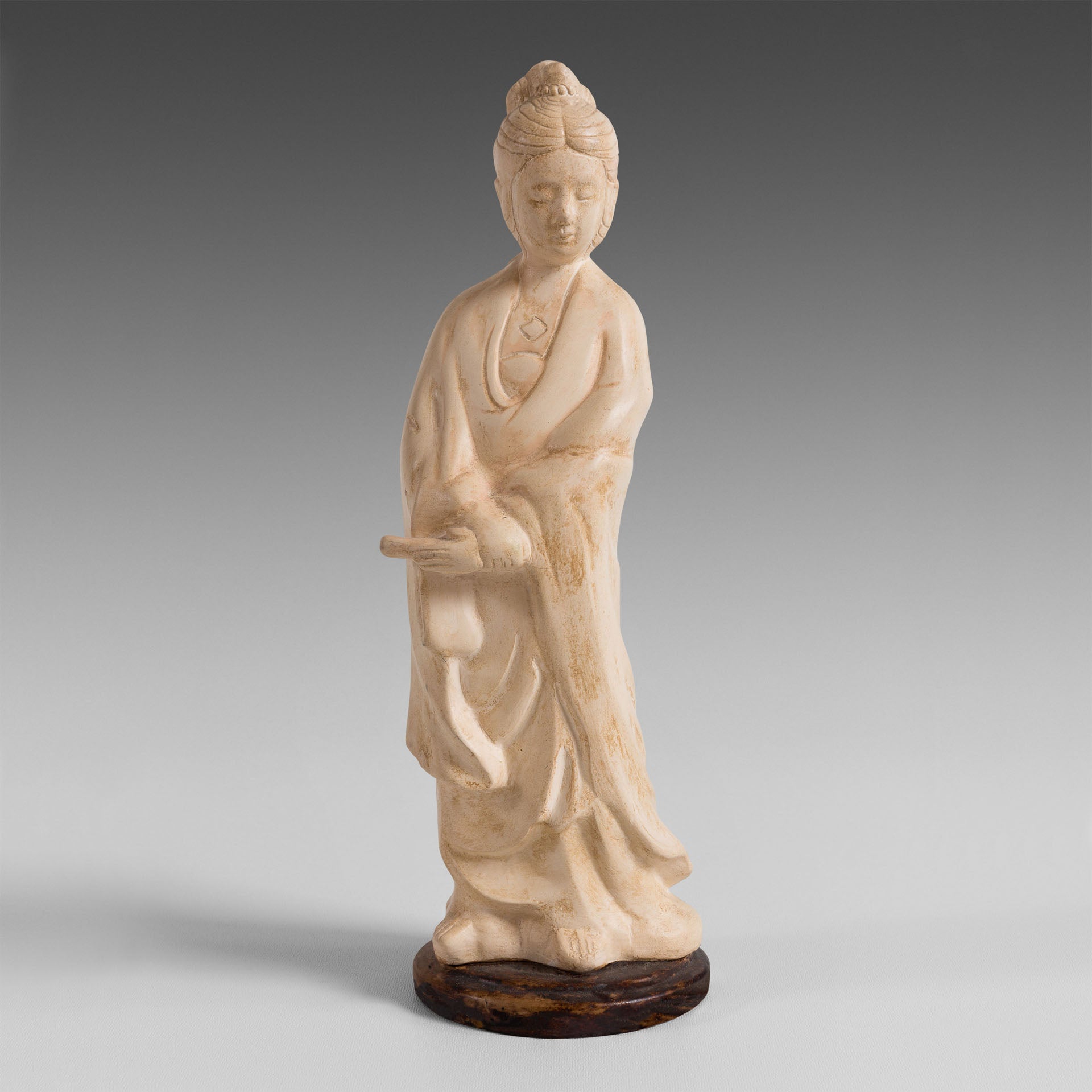 Cette statuette ne fût pas une « mingqi », un objet funéraire, l’ensevelissement avec des objets n’ayant plus cours sous les Ming. Elle a toutefois hérité de l’art millénaire des artisans chinois. L’artiste a utilisé la courbure de l’ivoire pour donner une posture élégante à cette dame tenant un éventail. Le plissé de la robe est soigné et le visage aux yeux clos est serein .