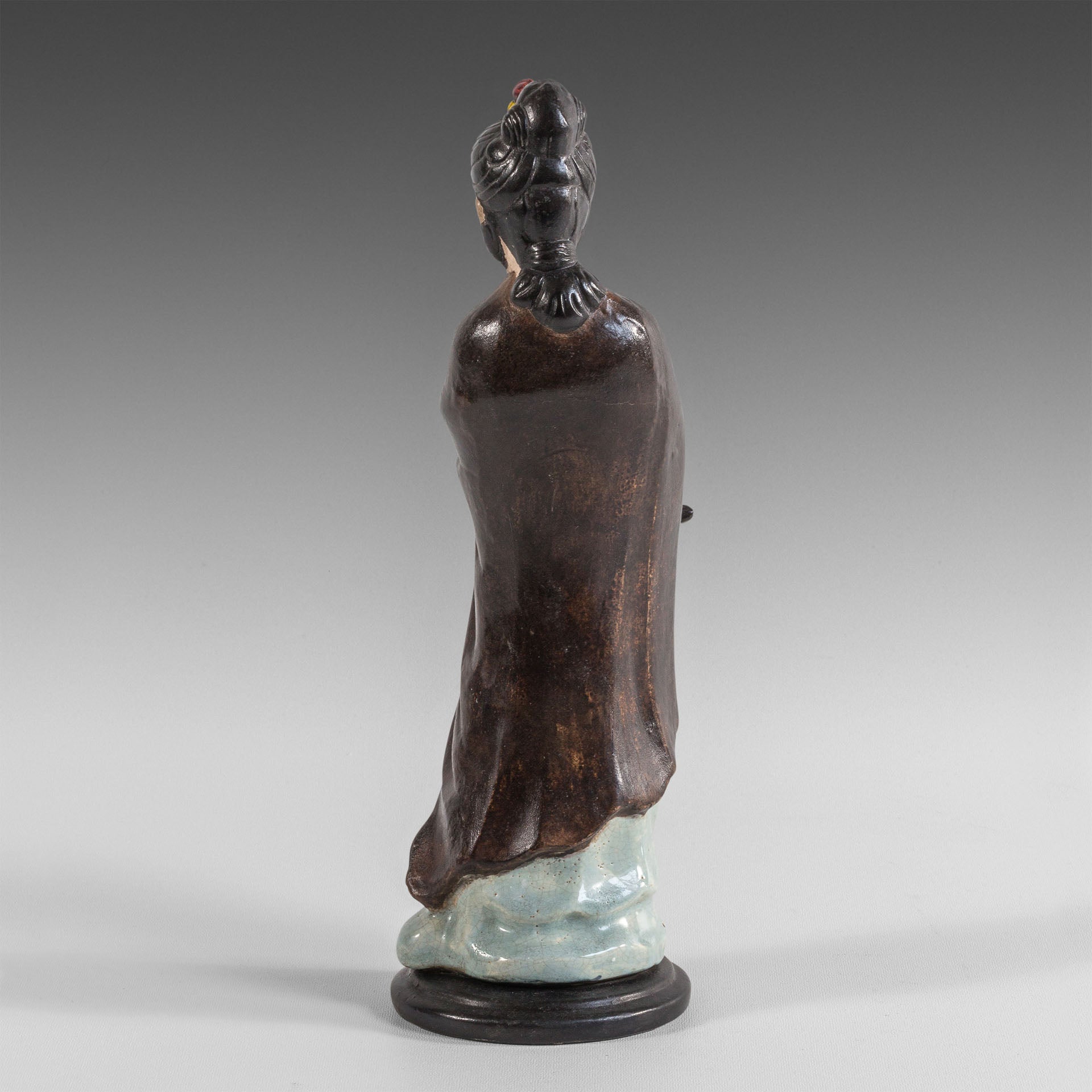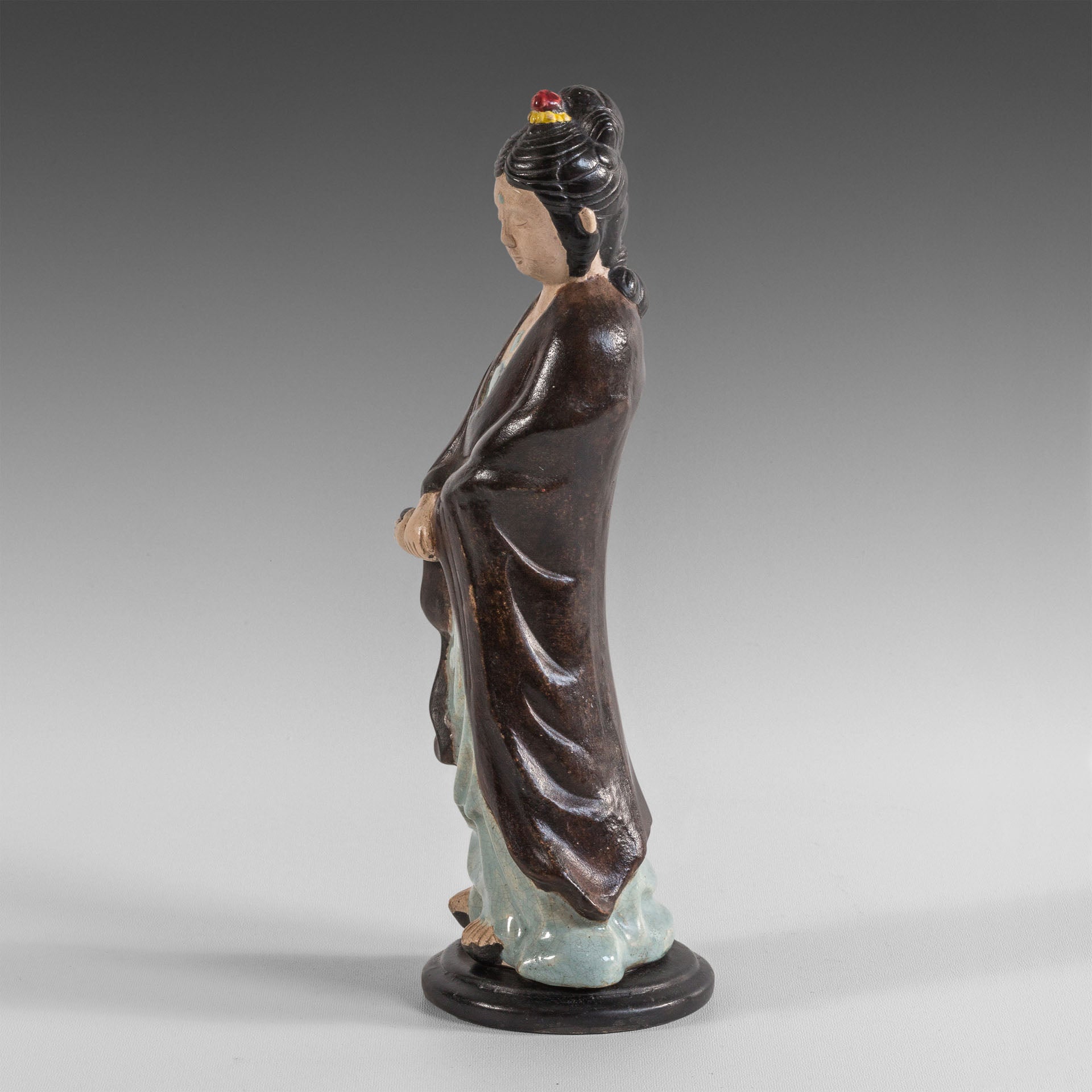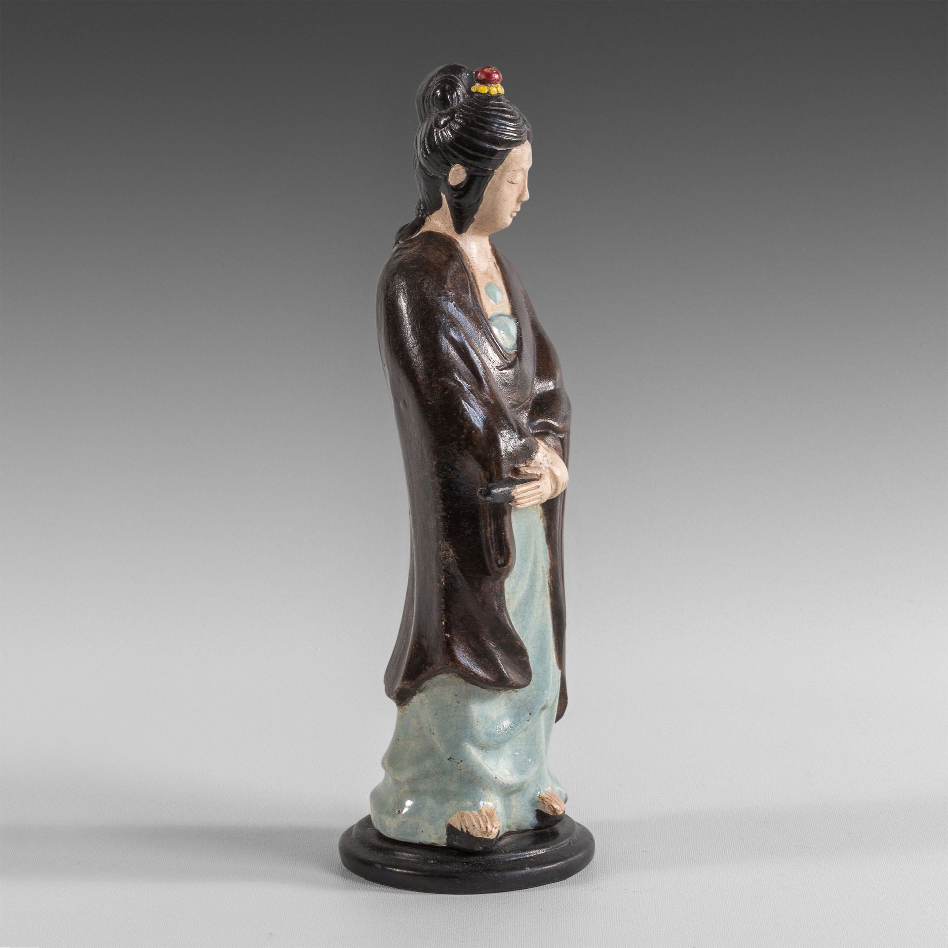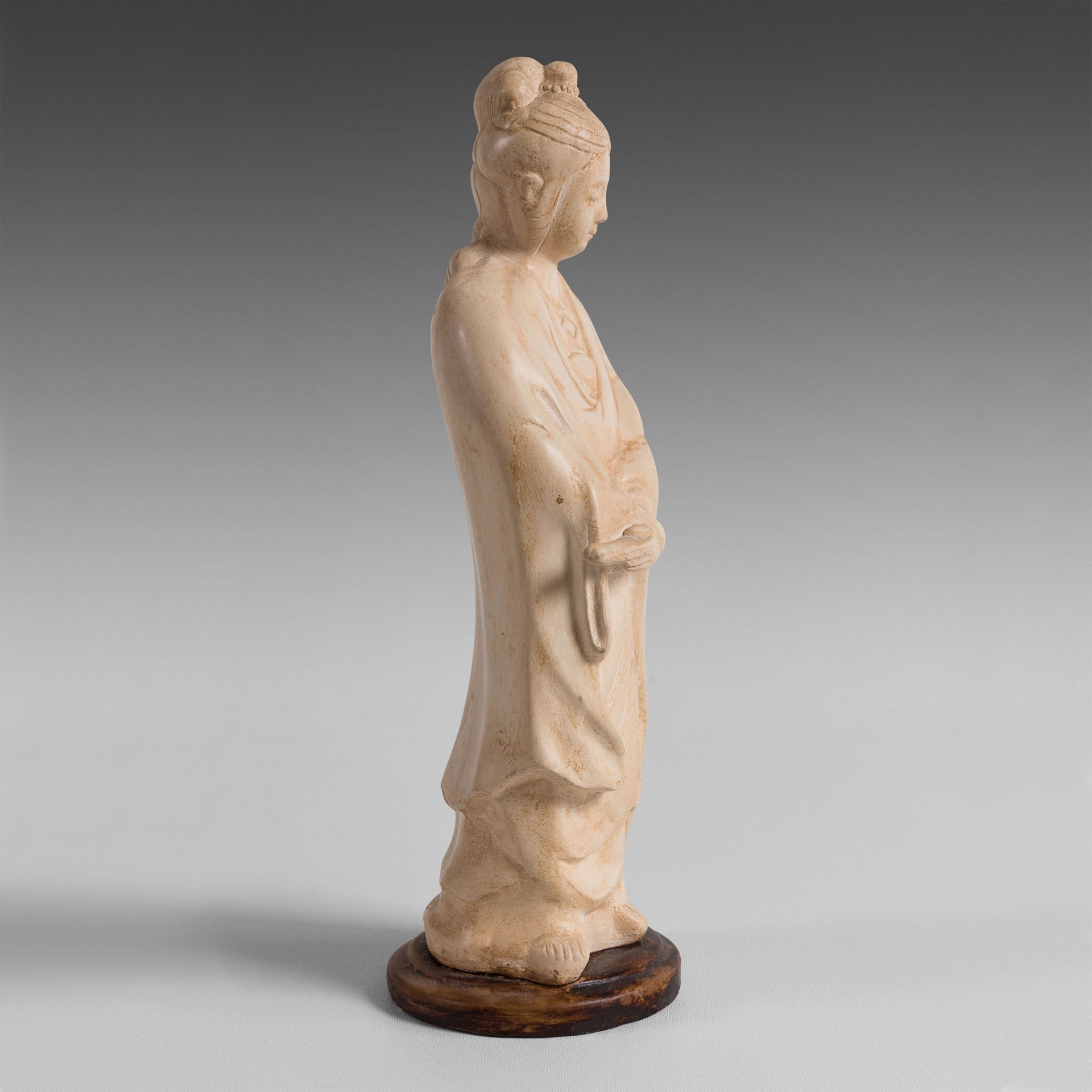 Cette statuette ne fût pas une « mingqi », un objet funéraire, l’ensevelissement avec des objets n’ayant plus cours sous les Ming. Elle a toutefois hérité de l’art millénaire des artisans chinois. L’artiste a utilisé la courbure de l’ivoire pour donner une posture élégante à cette dame tenant un éventail. Le plissé de la robe est soigné et le visage aux yeux clos est serein .