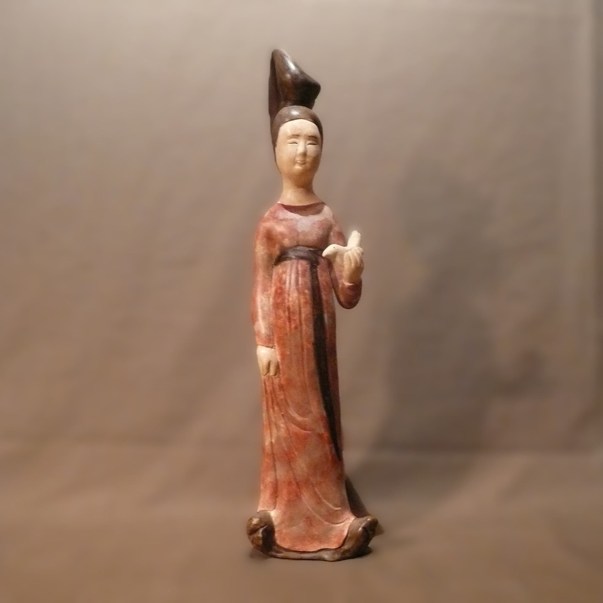 Pour cette "dame à l’oiseau", il existe un pendant qui tient une pomme. Contrairement aux "Fat Ladies" de la période précédente, celle-ci est grande, svelte, avec une attitude altière et un visage juvénile. Sa longue robe recouvre des chaussons recourbés, laissant juste apparaître ses mains et son cou. La main droite remonte sa robe comme si elle allait s’avancer tandis que de l’autre, elle tient un oiseau. Cette posture, ainsi que son cou frêle et son chignon en lame de sabre, lui confèrent une fragilité mêlée à une élégance troublante, comme si elle voulait imposer sa beauté.