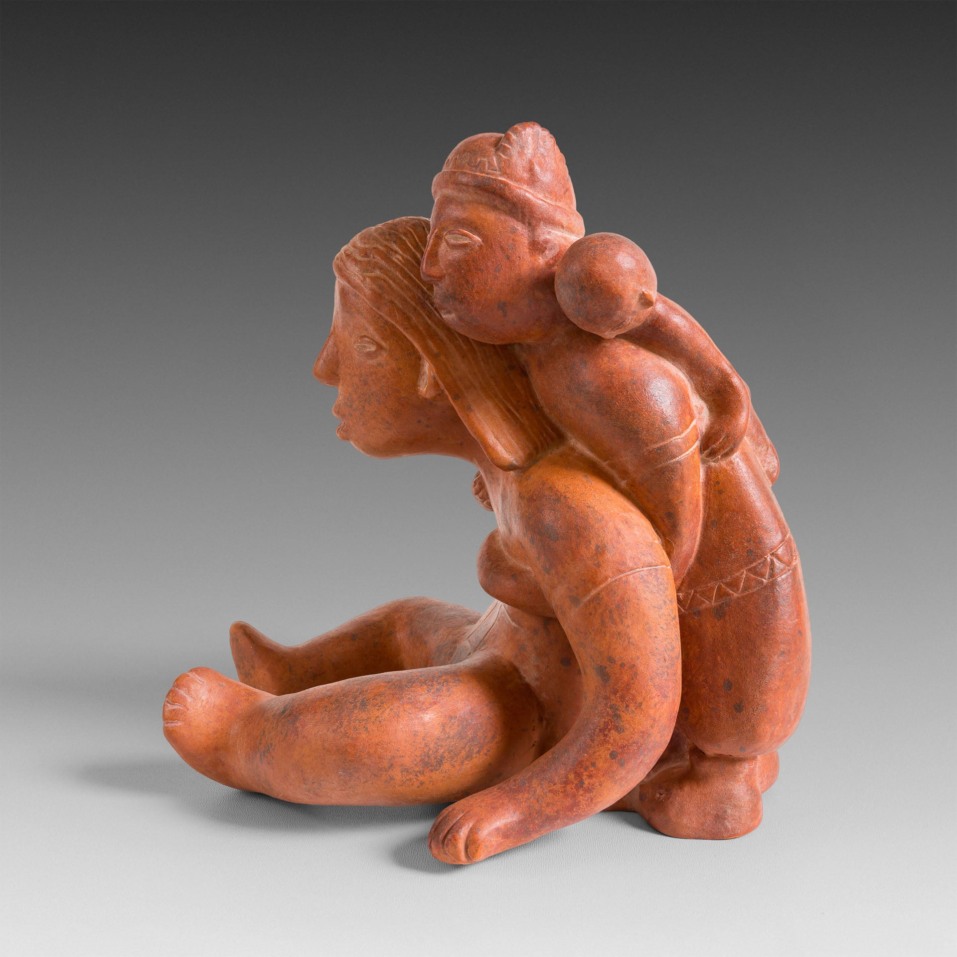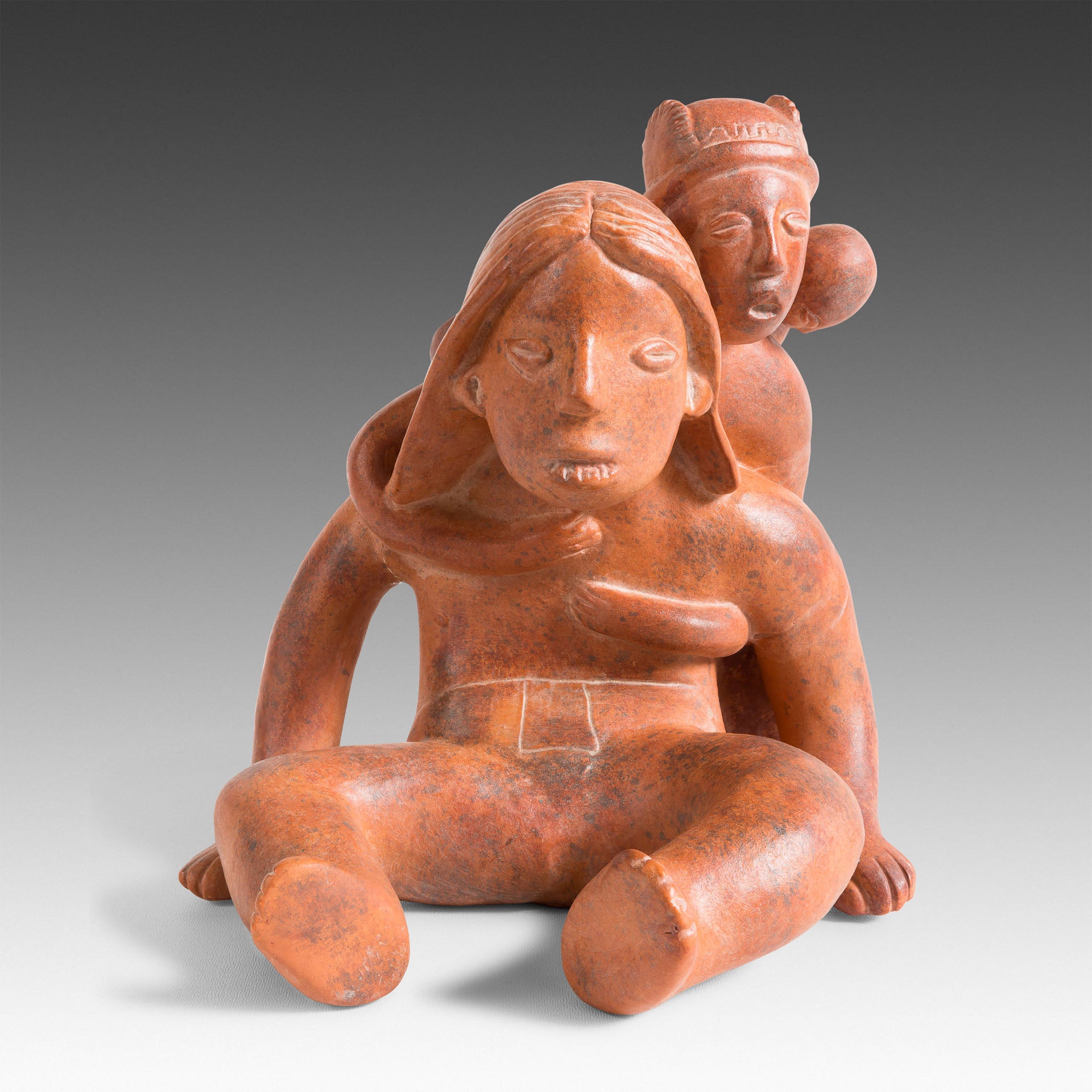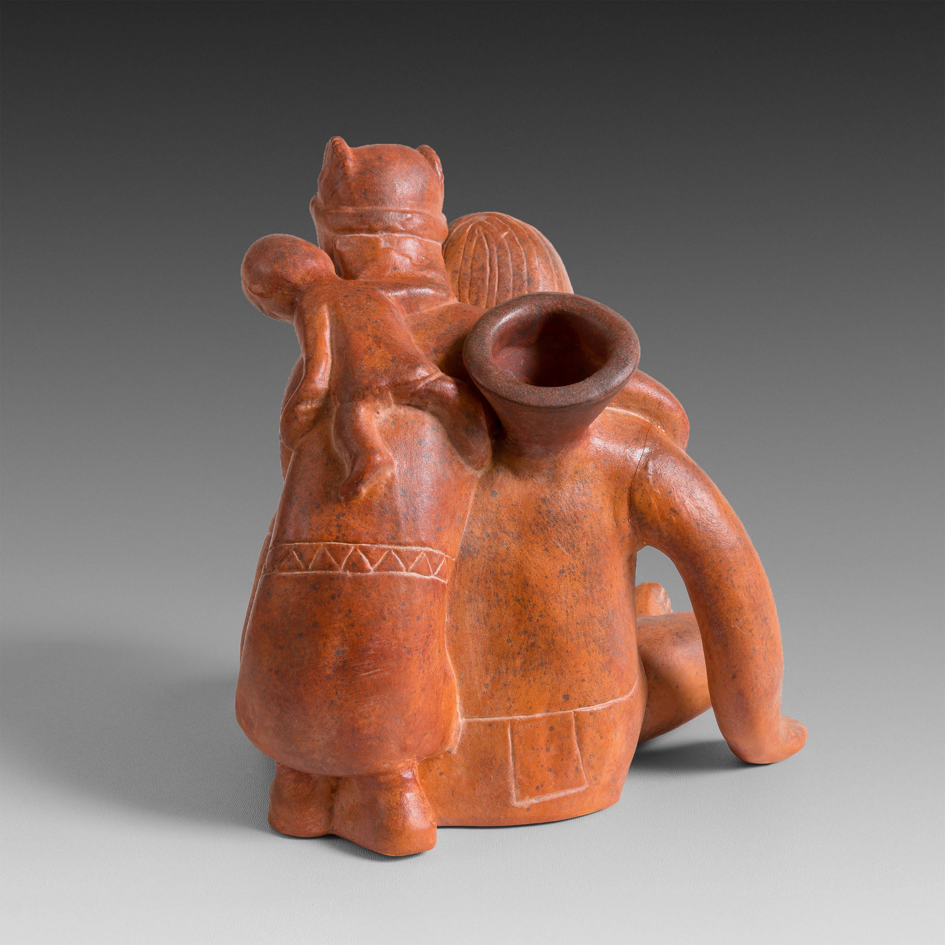 Parmi les pièces des Colimas plusieurs d’entre elles représentent des scènes de la vie quotidienne. Cependant cette scène qui montre un sentiment familial est exceptionnelle : le père, assis en avant, les mains sur le sol, la femme lui serrant la taille et le bébé nu couché sur le dos de sa mère. Les traits sont modelés avec beaucoup de réalisme. L’homme a les cheveux longs et libres, il porte un pagne court à pompons et il est paré de bracelets comme son bébé. La femme est vêtue d’une jupe longue et sur la tête elle porte une sorte de bonnet. Du dos de l’homme sort un verseur tubulaire, il s’agissait peut-être d’un récipient, soit un vase soit une urne.