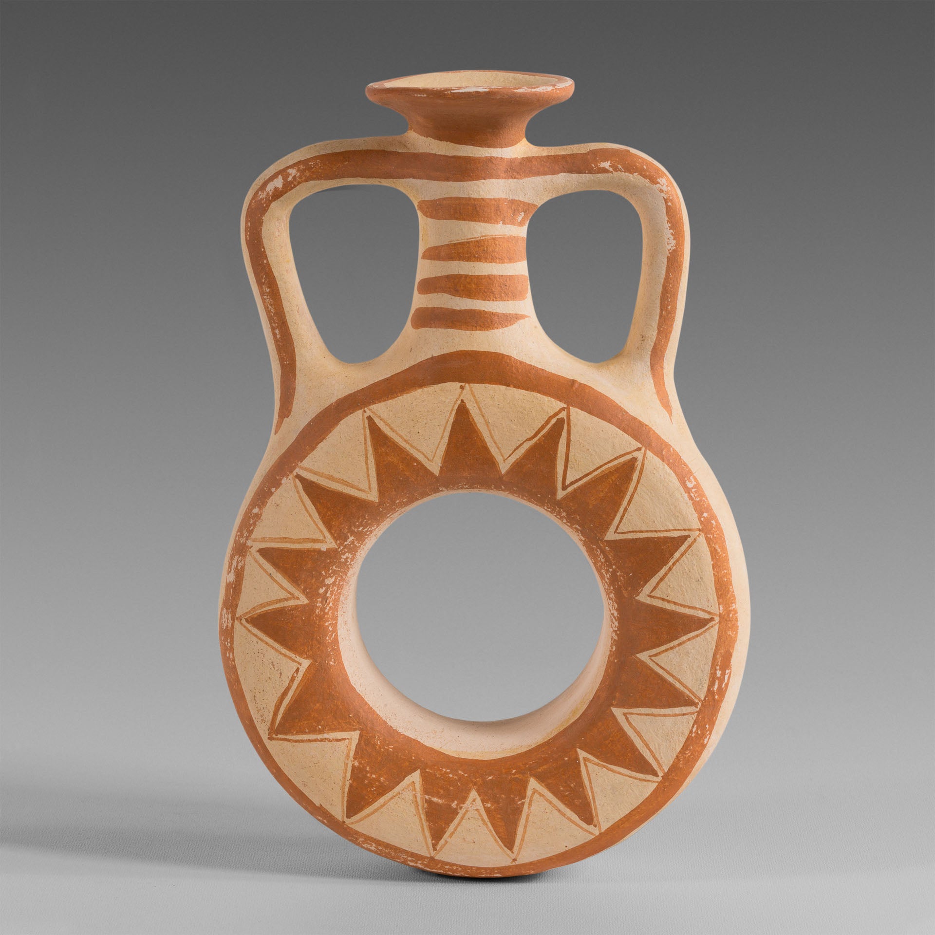 Les archéologues ont retrouvé beaucoup d’objets de la vie quotidienne dans les tombes chypriotes du XIVème siècle av. J.C ce qui nous permet de connaître les rituels liés aux repas. Cette petite gourde est a panse en forme de baril avec anses aux extrémités Son originalité vient de sa partie centrale évidée. Les décors sur fond clair rappellent les rayons du soleil.
