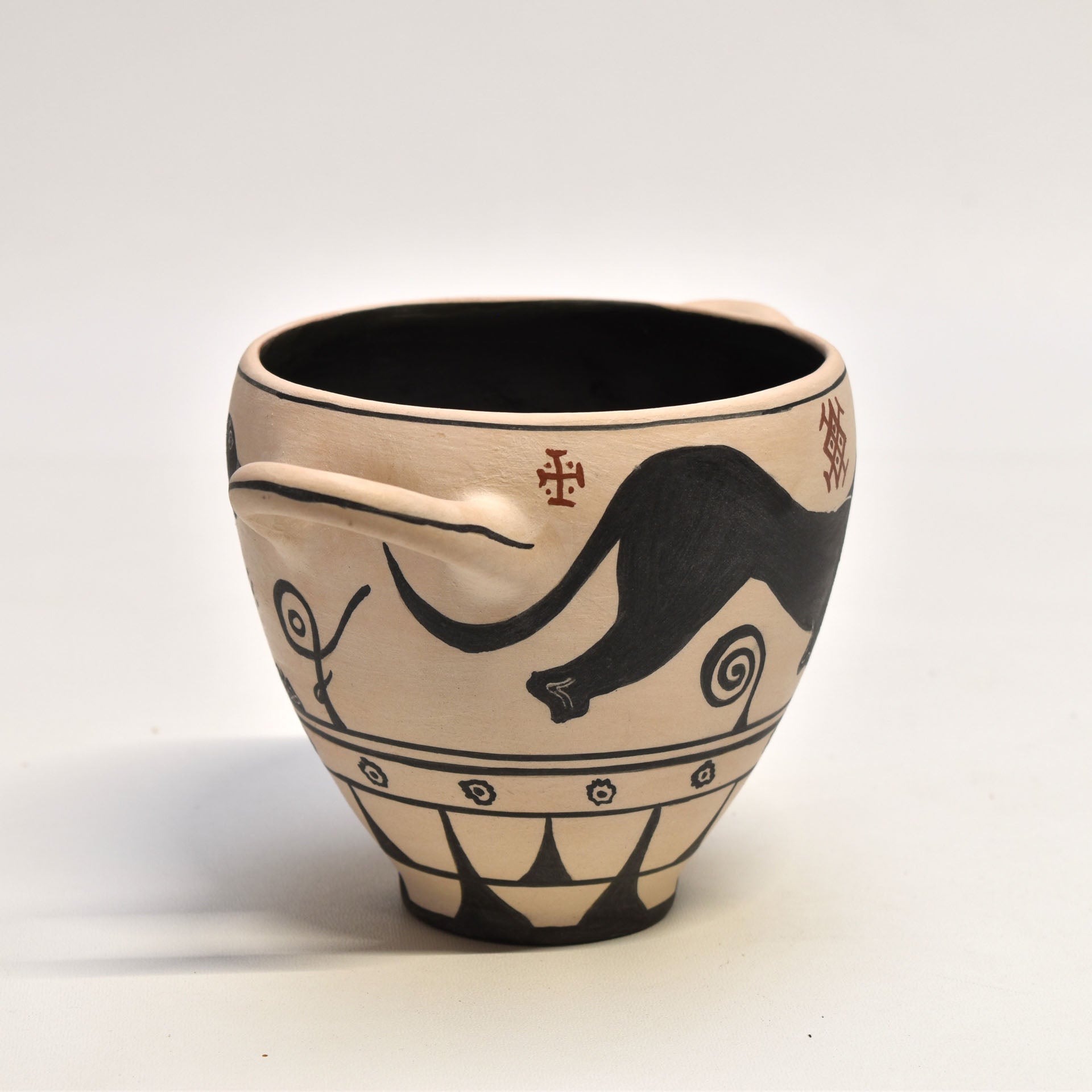 - Décors à l'engobe : cette technique est l'une des plus ancienne utilisée pour décorer la céramique. Il s'agit de terre à laquelle on ajoute des pigments de couleur. Les possibilités sont infinies. Cela permet des décors fins et précis mais ne protège, ni ne solidifie la céramique.