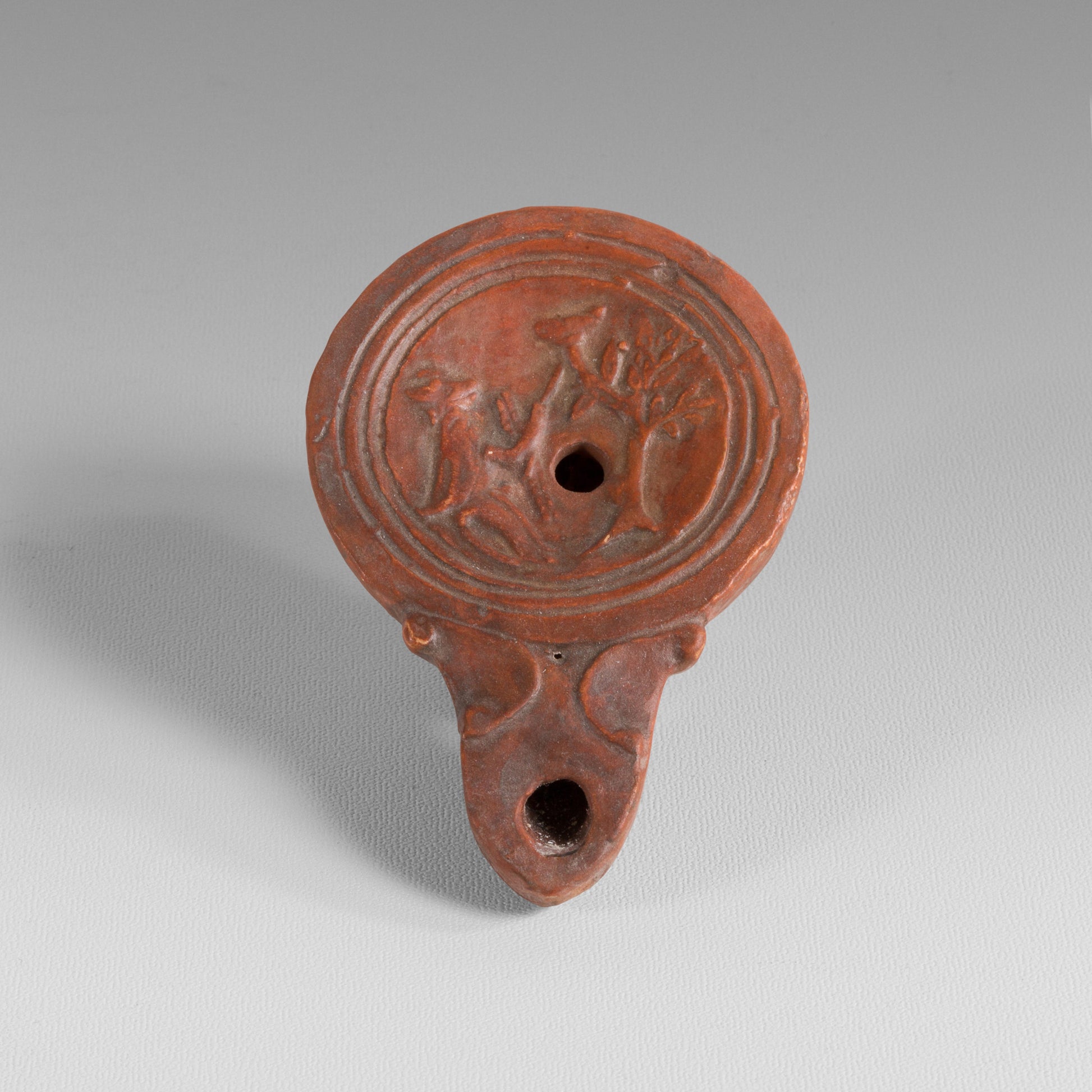 Reproduction en terre cuite d'une Lampe à huile Ésope Le corbeau et le renard