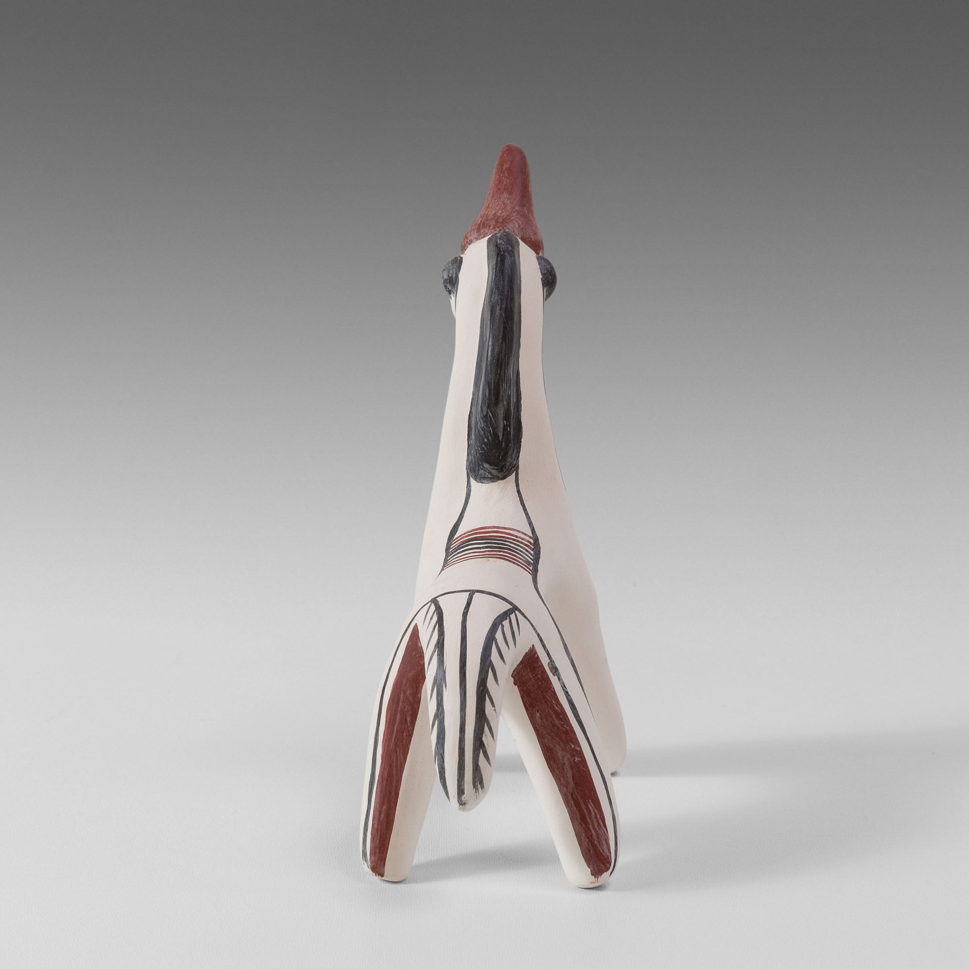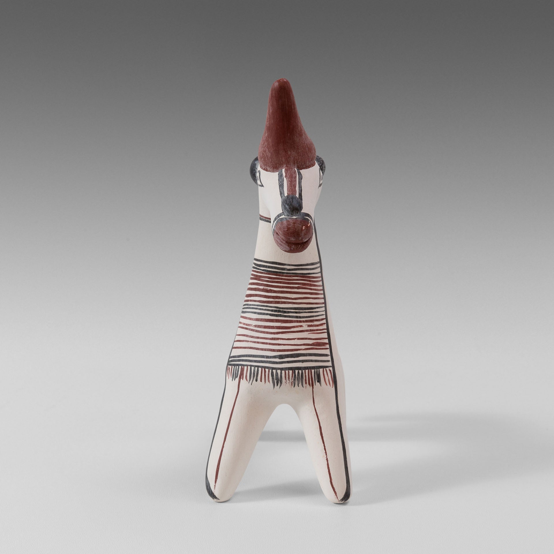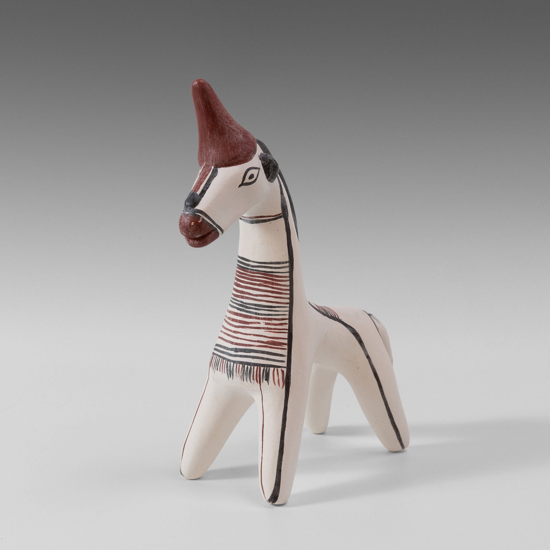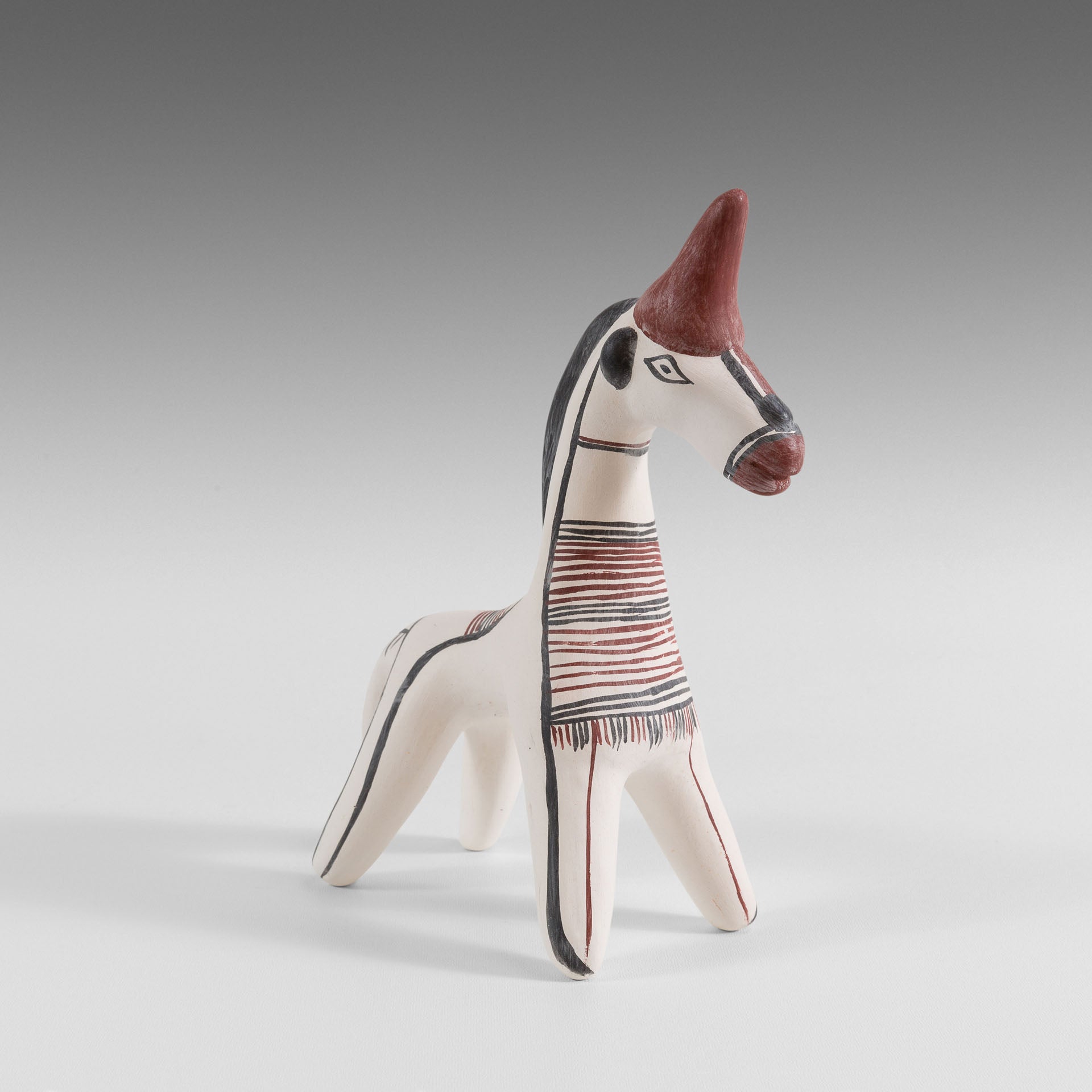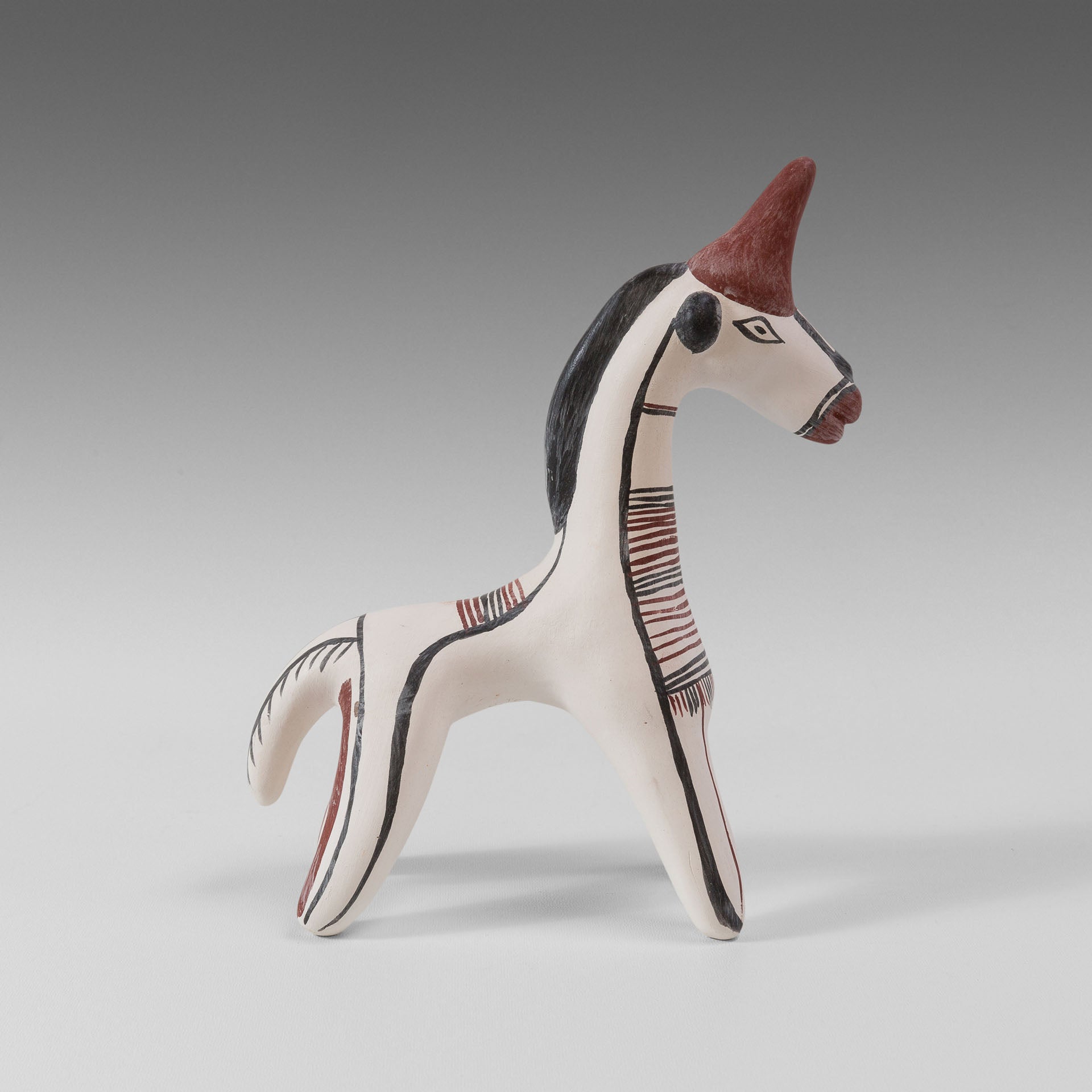 Grâce à l’insularité de Chypre, les archéologues à la fin du 19ème siècle ont découvert beaucoup d’objets archéologiques en terre cuite et en métal du quotidien de la civilisation qui s’y est développée. Parmi ces objets, on a découvert beaucoup de jouets d’enfants en terre cuite. Des animaux domestiques ou sauvages étaient représentés ainsi que des chars et des cavaliers avec leur monture. Plus rarement le cheval seul, comme celui-ci. Malgré l’appellation des archéologues lors de sa découverte, il ne s’agit pas d’une licorne. La tête est parée d’une sorte de décoration et des tissages sont représentés sur le plastron et le dos de l’animal. Comme toujours dans ce genre d’objet, l’accent est porté sur les décorations peintes.