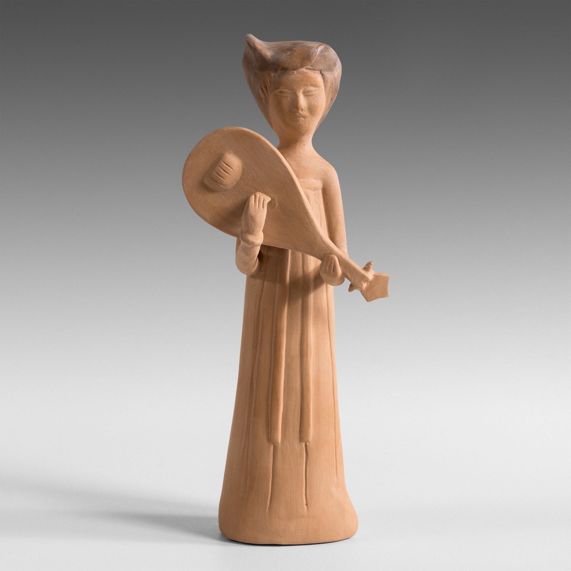 Les statuettes de musiciennes ont été produites en grande quantité très tôt dans l’histoire de la Chine. La tradition voulait que l’empereur et les nobles se fassent inhumer avec un ensemble de statuettes, appelés des « Yong » représentant leur cour, pour pouvoir les servir et les divertir après la mort. Le premier exemple et le plus impressionnant est l’armée de terre cuite de l’empereur « Quin », mais l’apogée de celle-ci se situe à l’époque des Tang.