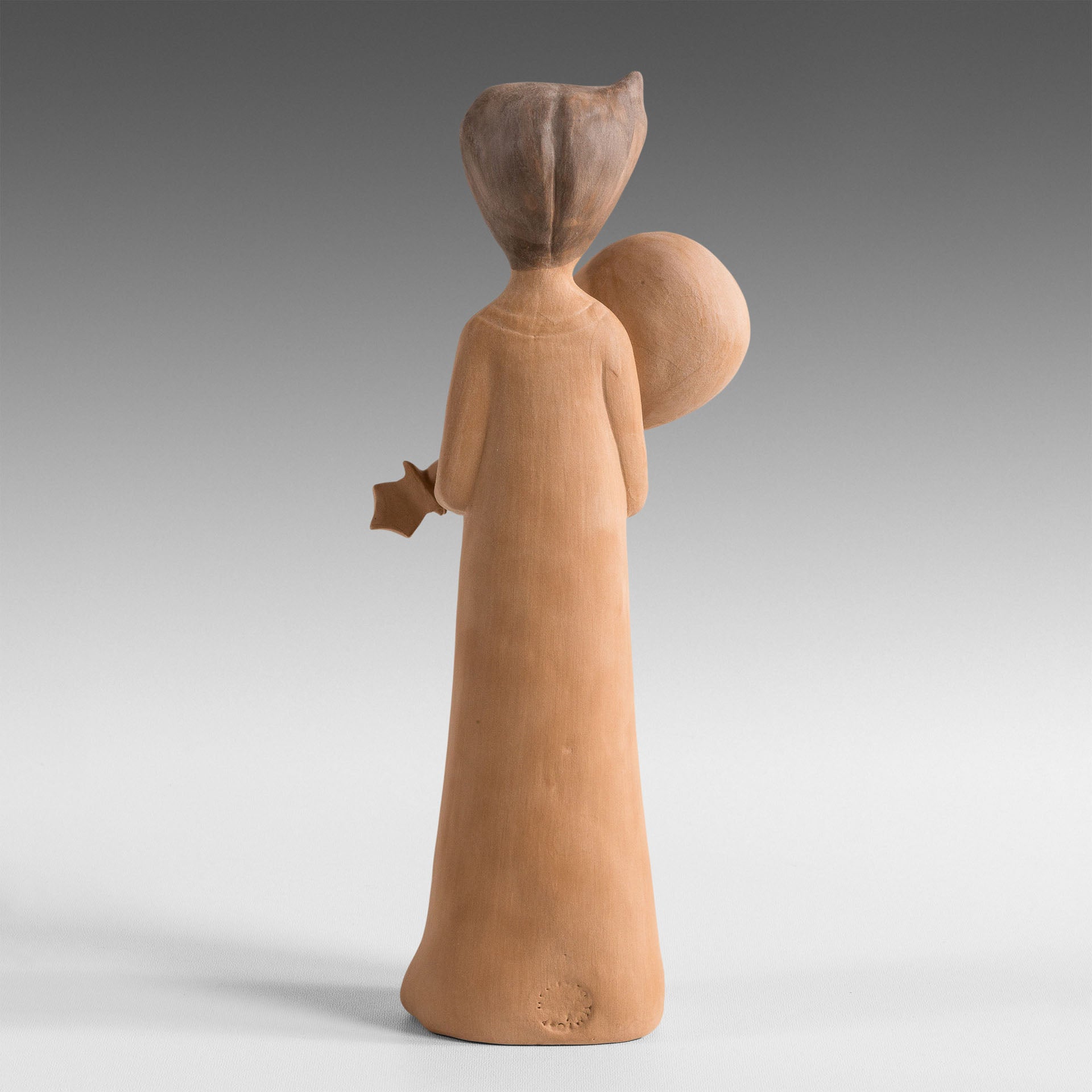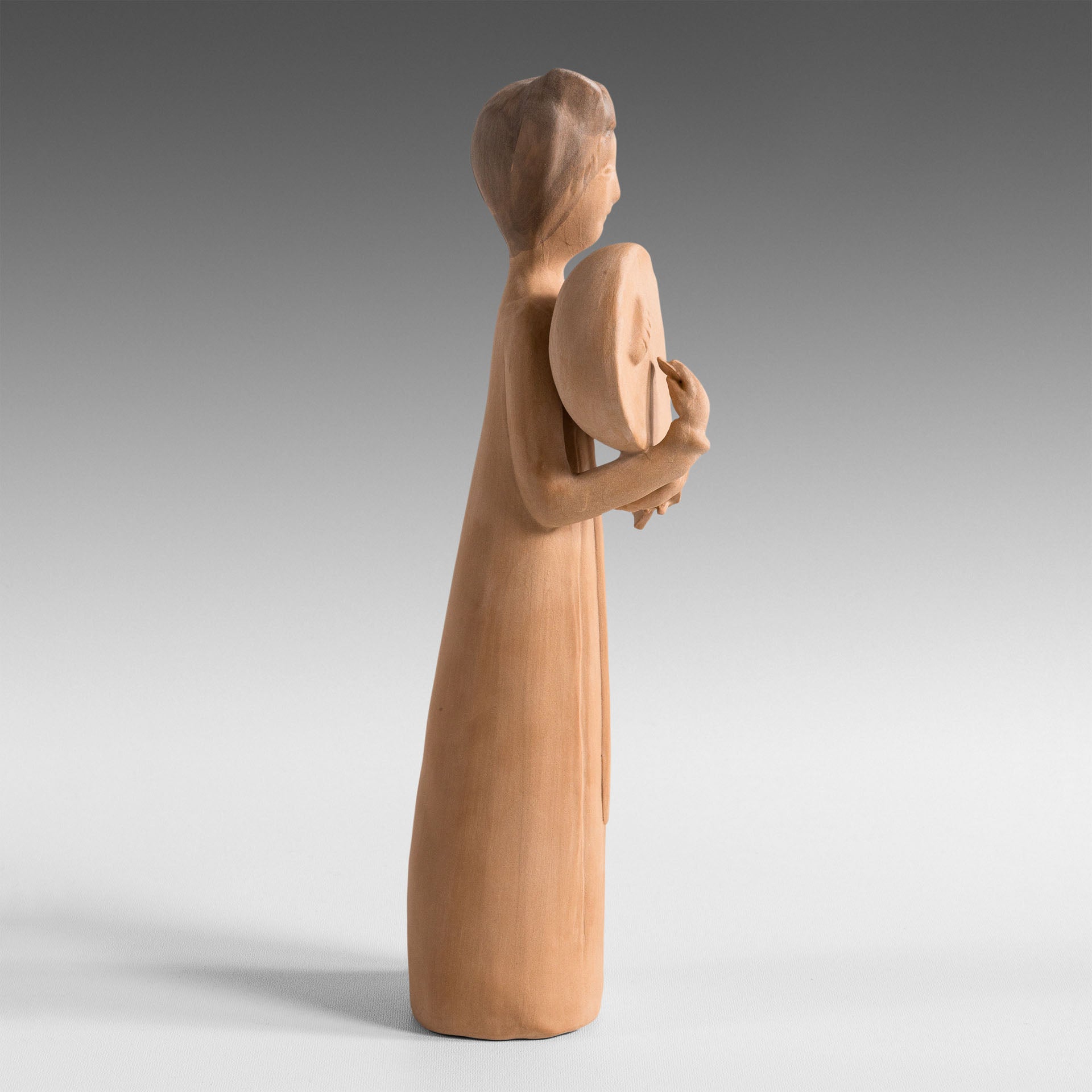 Cette joueuse de luth fait partie d’un ensemble de joueuses et de d’accompagnatrices. Leur fabrication en série leur donne la même allure, leur corps étant issu du même moule, seul l’instrument de musique les personnalise.