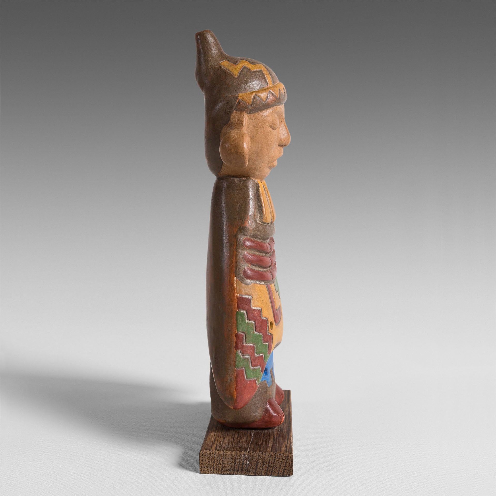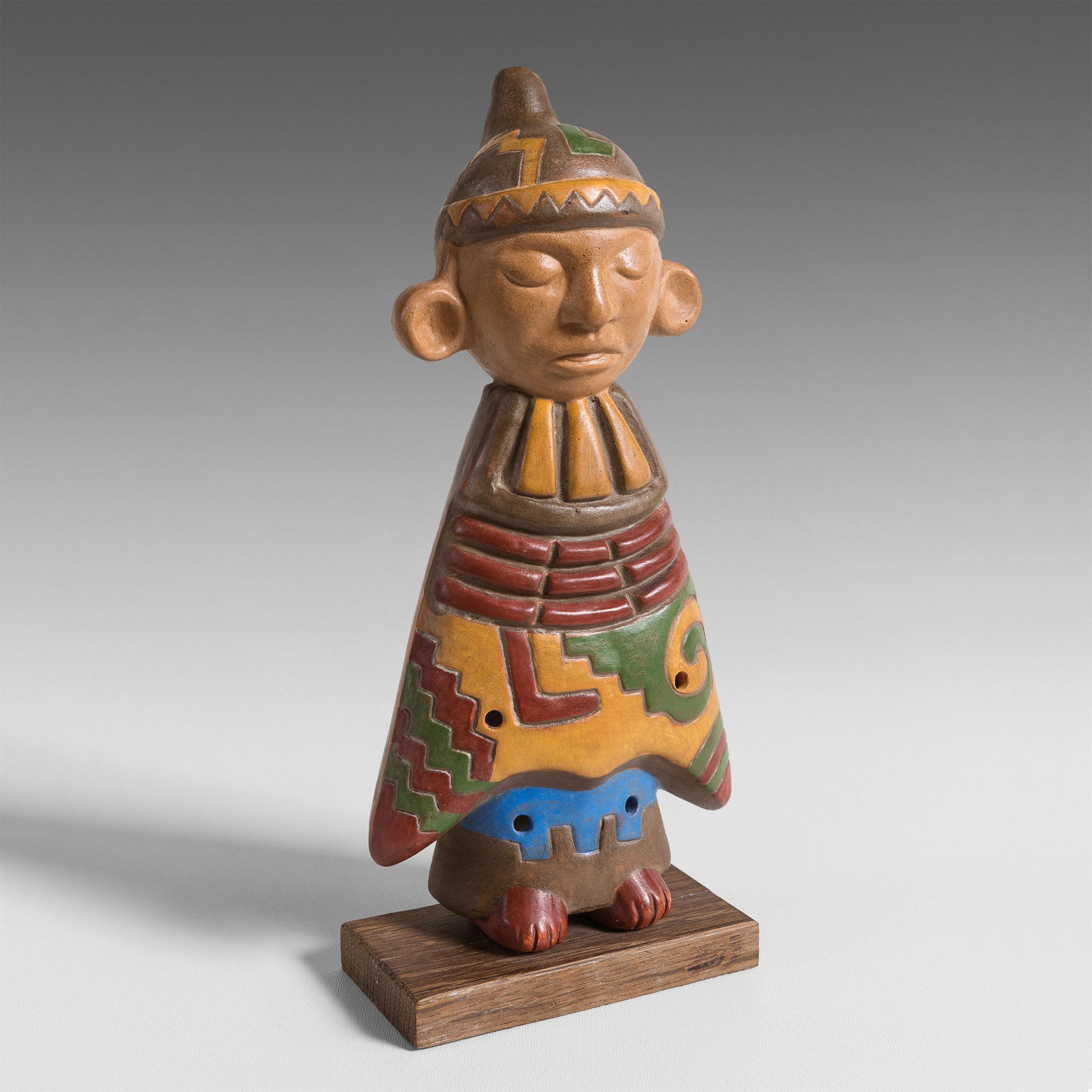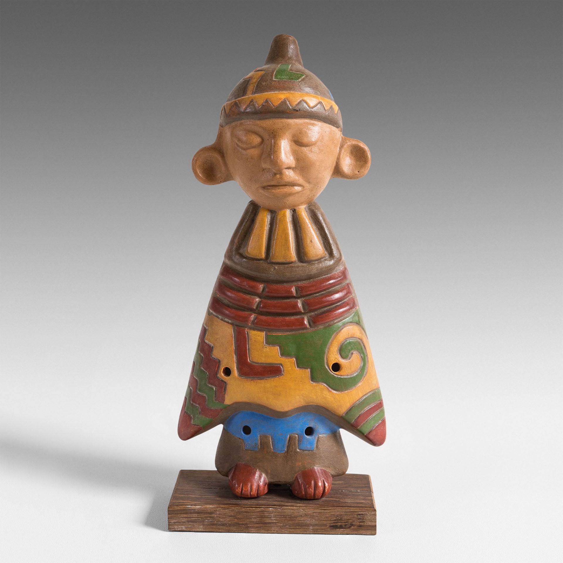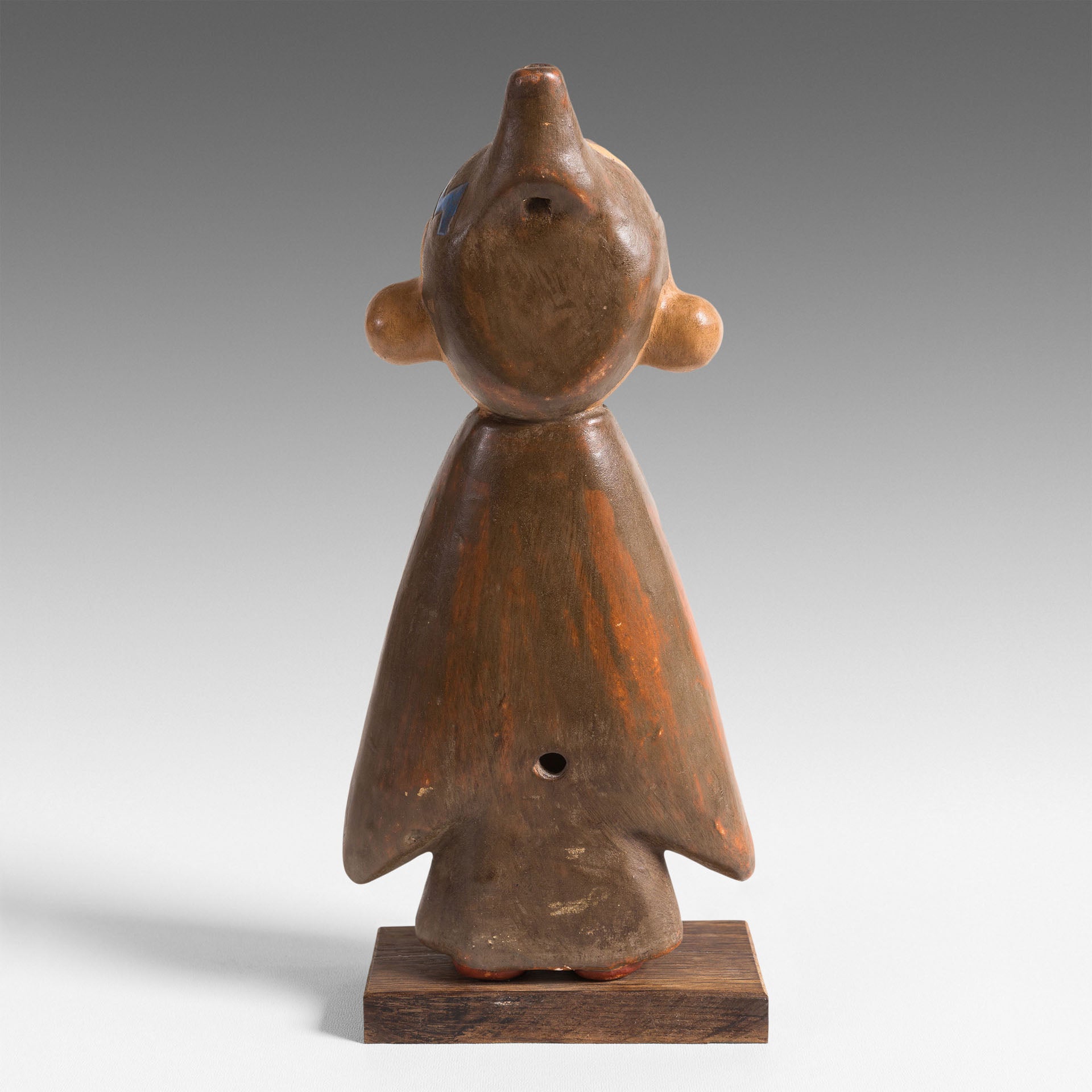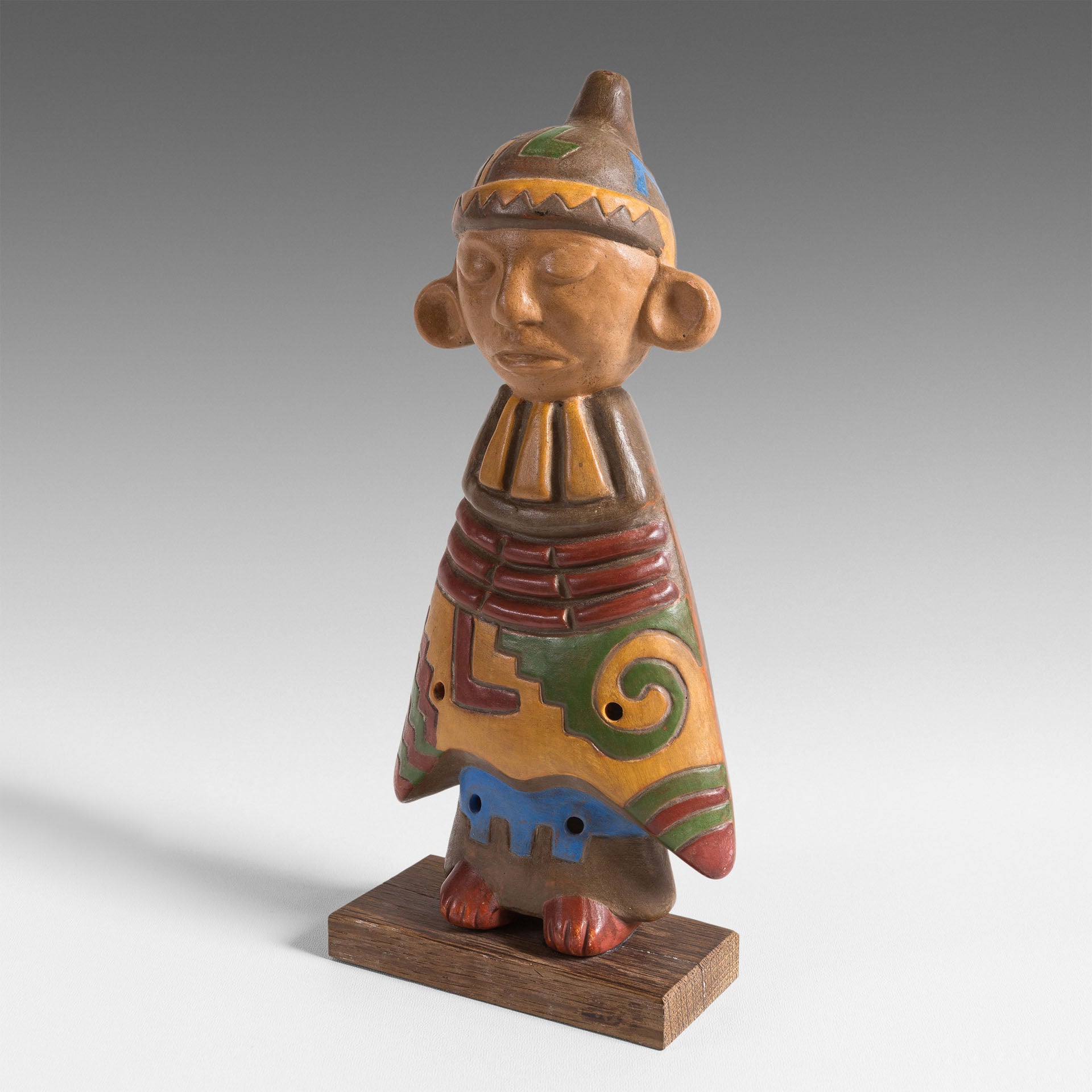 Cet ocarina est particulièrement attachant par sa représentation d’un personnage. Tout son corps est l’instrument de musique. Son « Poncho », décoré de motifs géométriques caractéristiques des Paracas, ne laisse découvrir que le bas de ses jambes et ses pieds. Le profil de sa tête est reconnaissable des populations andines. La forme du bonnet qu’il porte recèle judicieusement l’embout du sifflet de l’instrument.