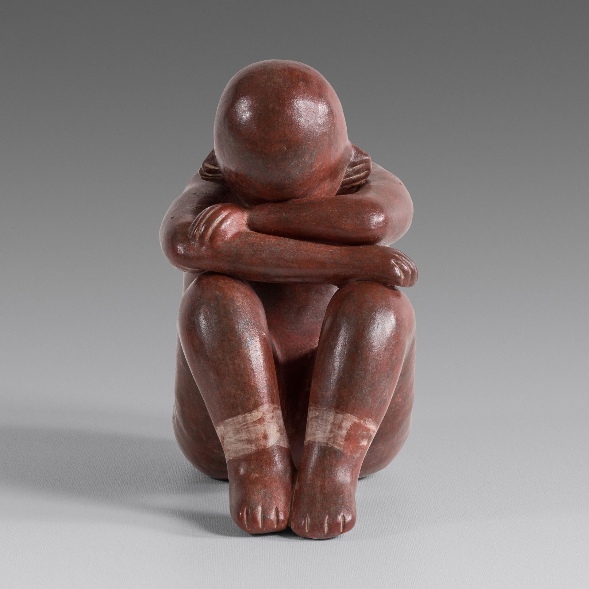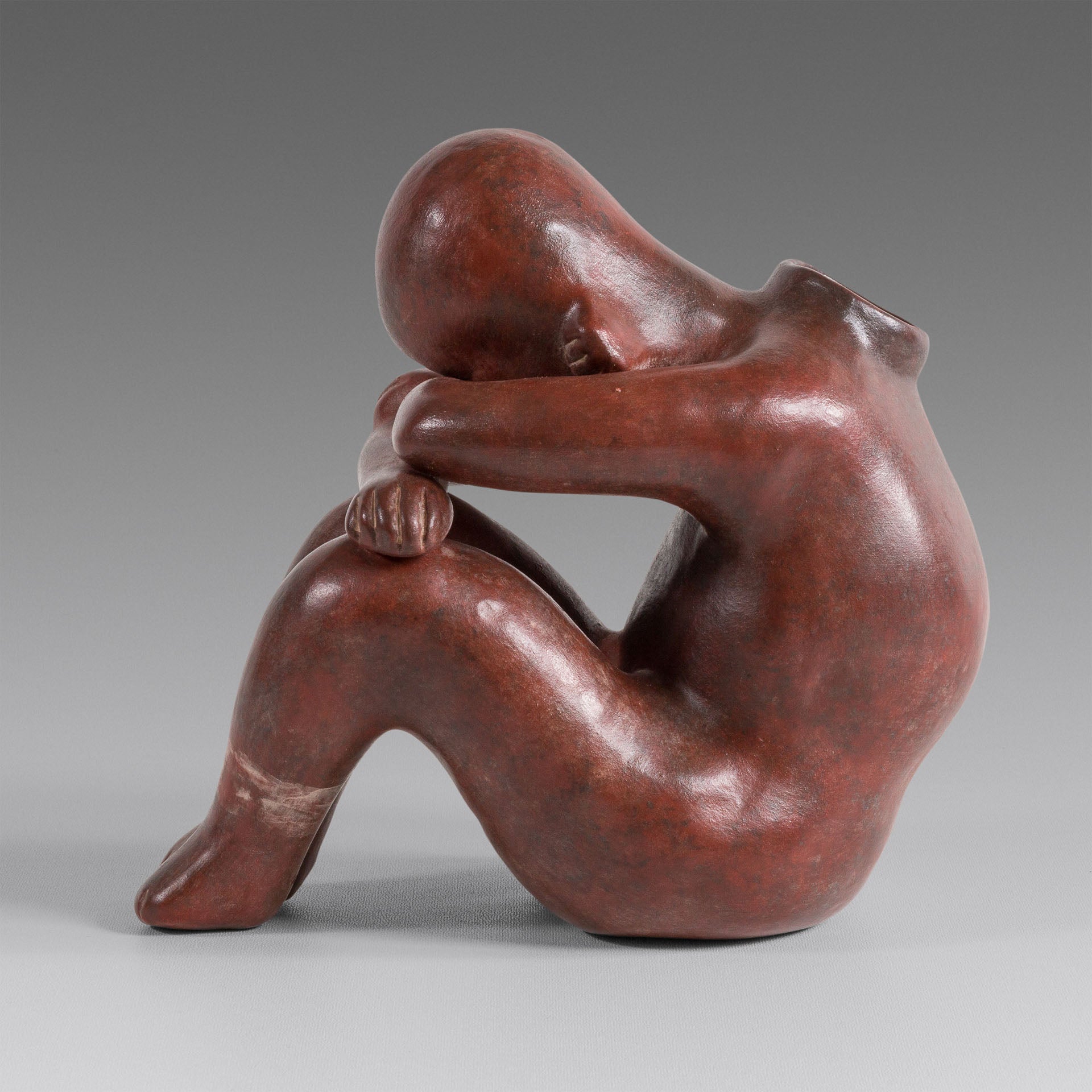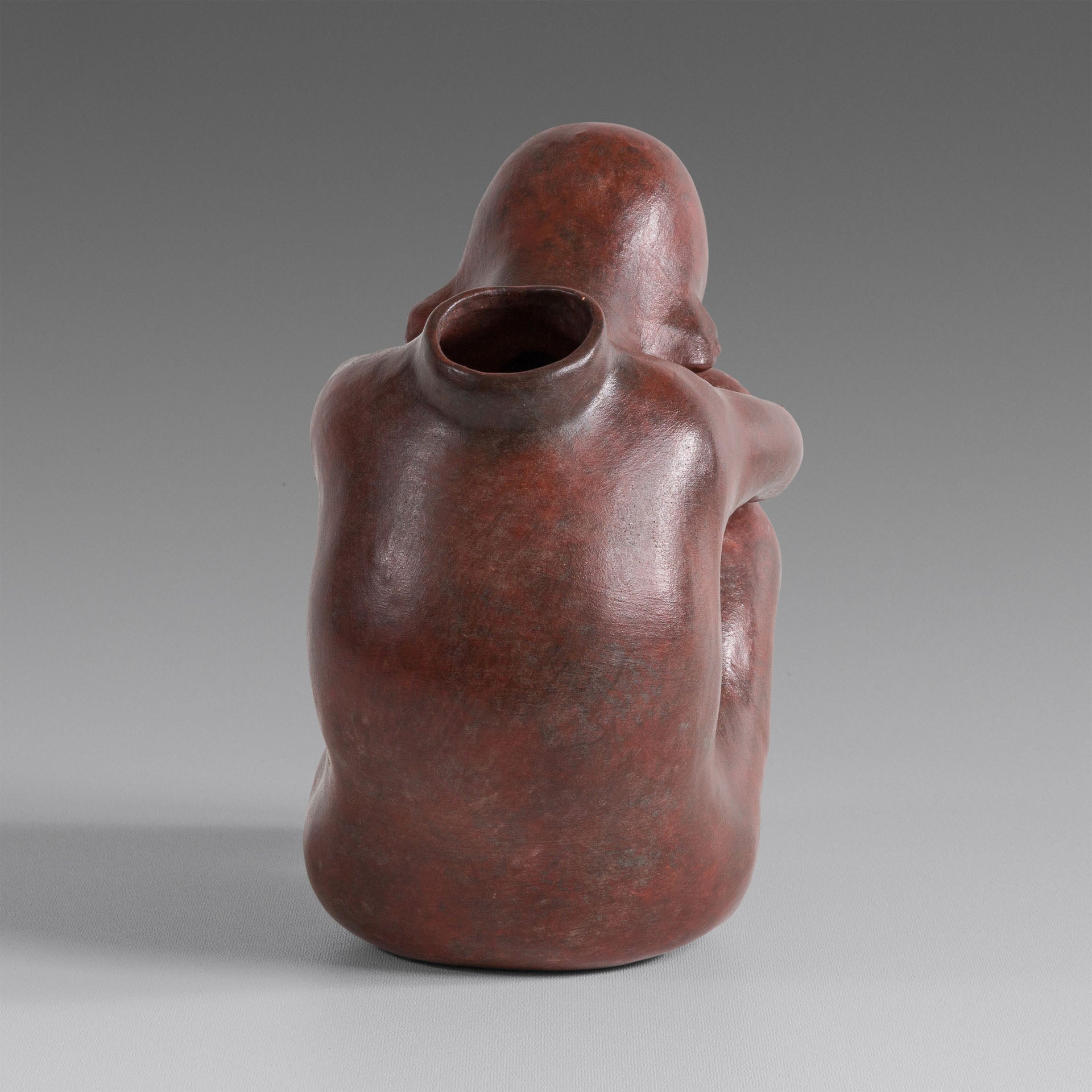 Ce personnage modelé avec de bonnes proportions est un élément original de la céramique Colima. En effet, celui-ci est représenté sans vêtement ni accessoire. Seules les mains, les pieds et les oreilles sont signifiés avec de simples incisions. Une ouverture avec un col est présente en haut du dos. Comme pour la plupart des céramiques Colima, la destination du récipient est inconnue, il s’agit peut-être d’un vase ou d’une urne.