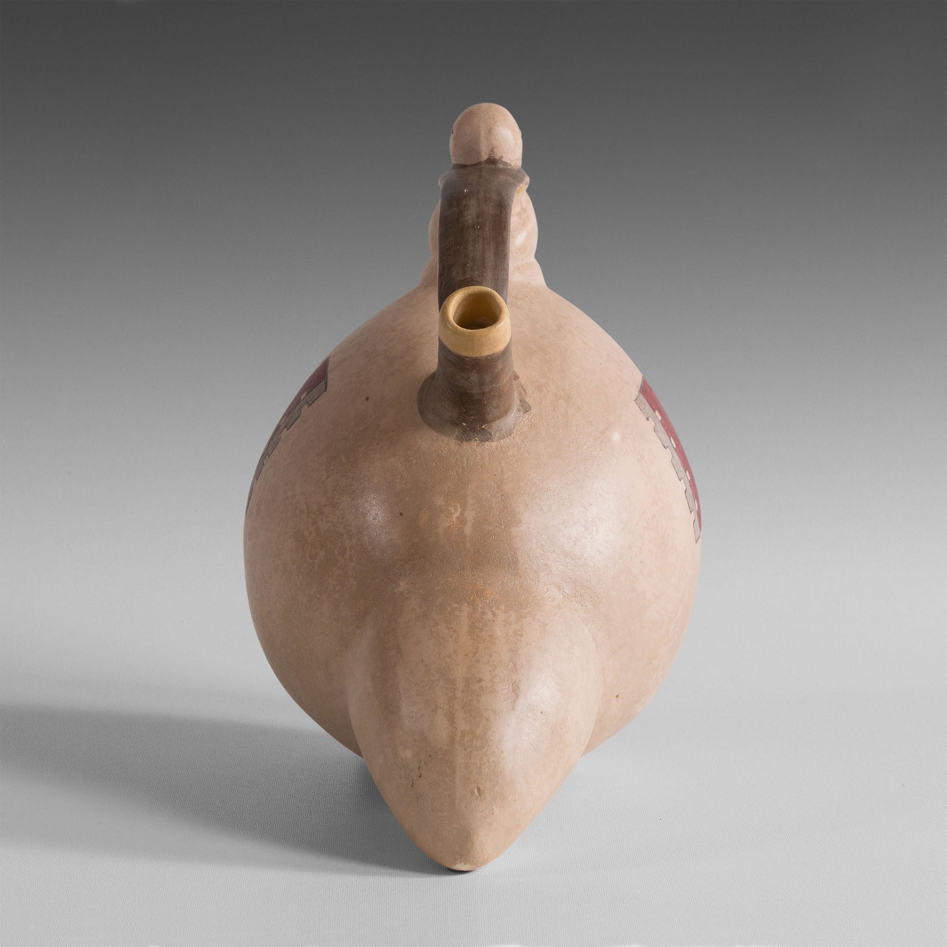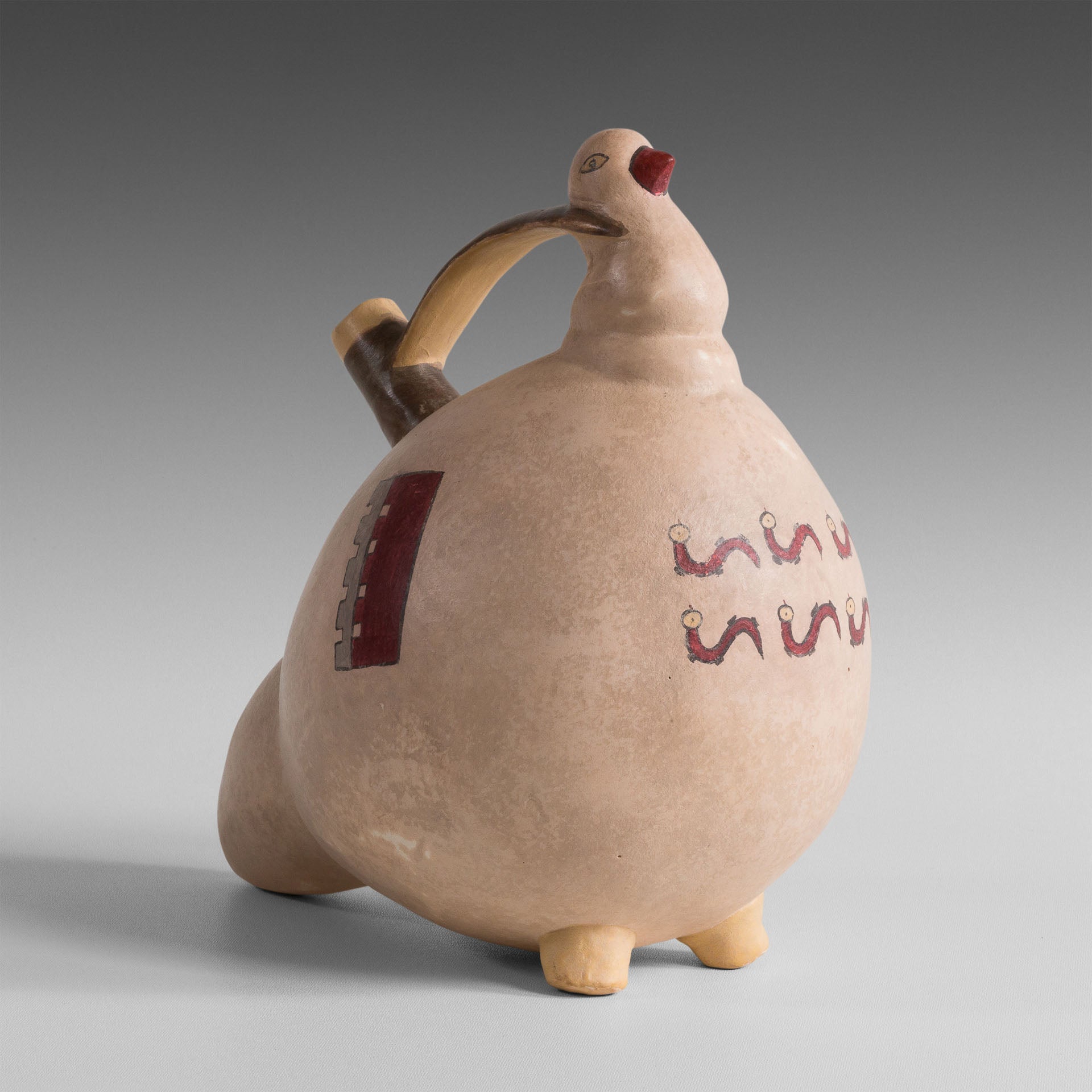 La céramique Nazca a conservé la tradition Paracas des récipients anthropomorphes et zoomorphes. Si le modèle initial de cette pièce est la jarre à double goulot et à anse-pont, sa forme évoque un pigeon, gonflant la gorge et déployant la queue, un des deux goulots forme le cou et la tête, le corps étant couvert d’un engobe blanc crème et les ailes indiquées par deux motifs géométriques dentelés. Sur la poitrine de l’oiseau, sont peints deux rangs de petits animaux en « S », peut être des verts ou des chenilles dont le pigeon est friand. Ce récipient servait de gourde dont le goulot était étroit pour éviter l’évaporation de l’eau.