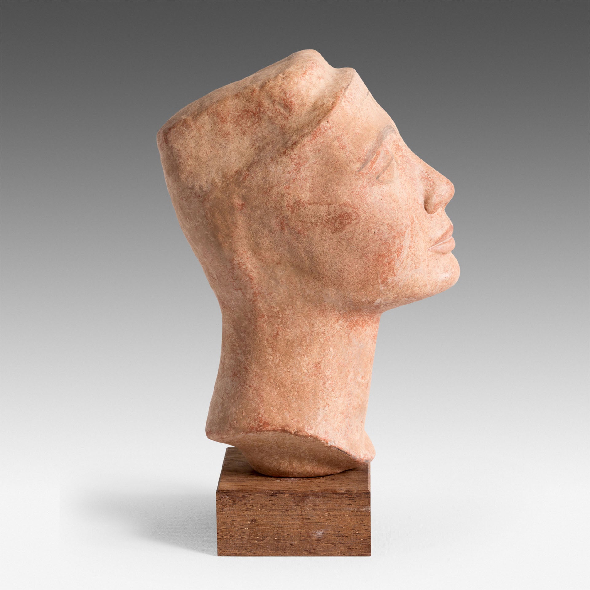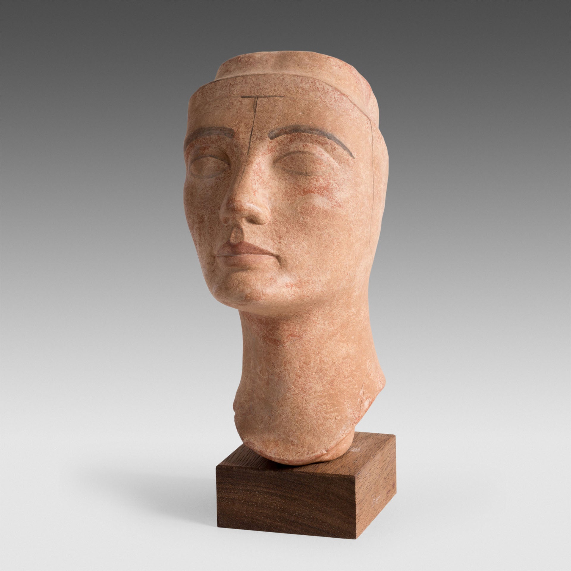 Cette tête est particulièrement élégante, elle représente la grâce d’une femme de caractère avec ses sourcils étirés vers les tempes, ses yeux mi-clos par les paupières légèrement baissées et la bouche mystérieuse. Le tracé de l’artiste est encore visible.