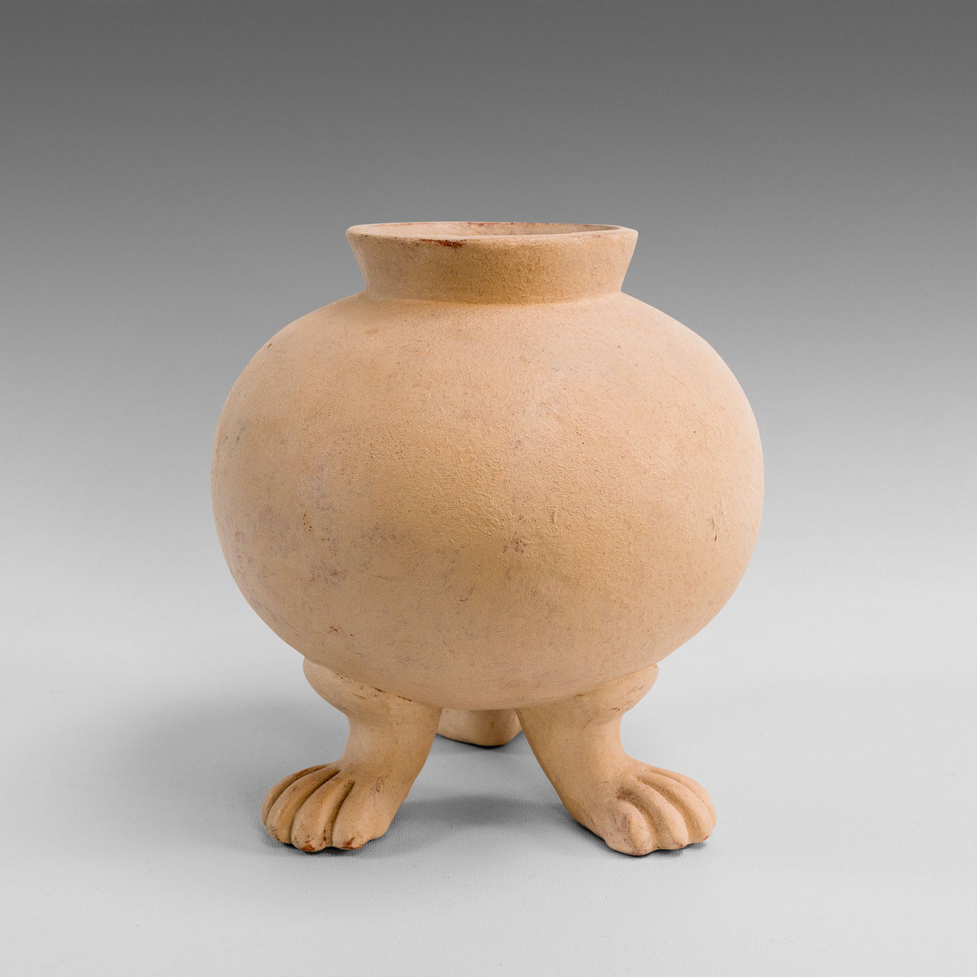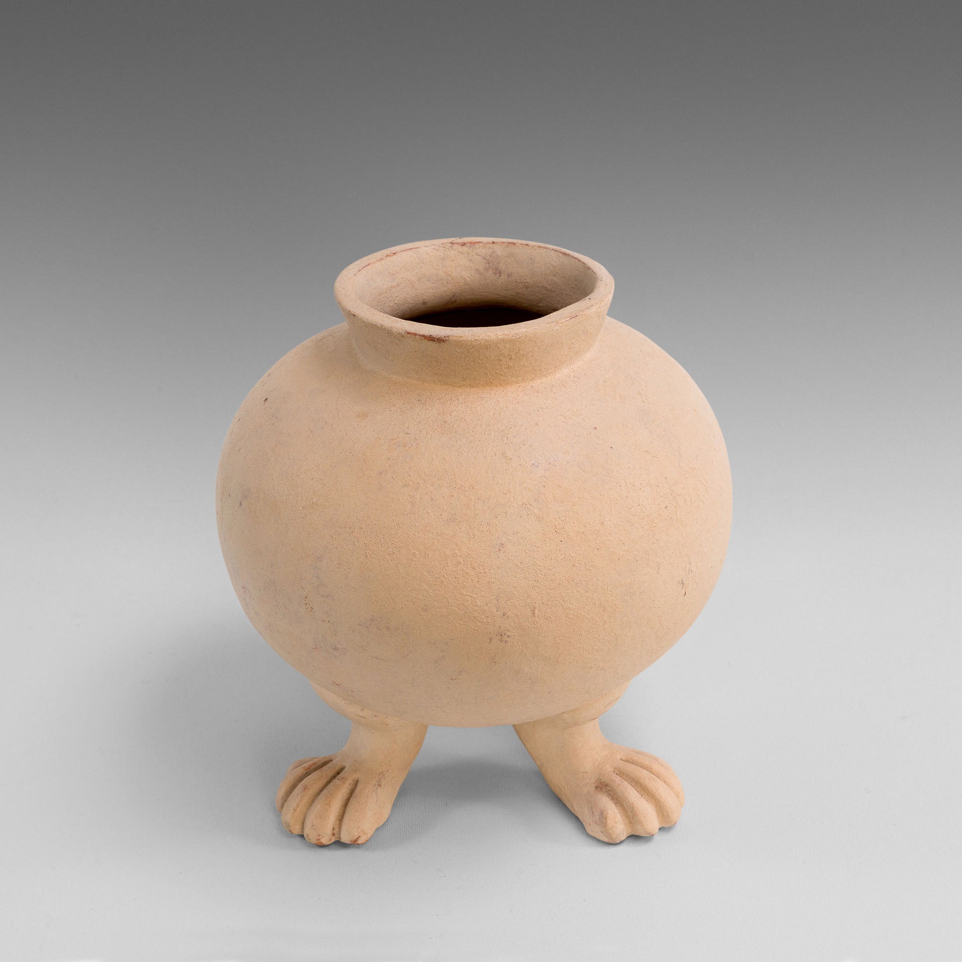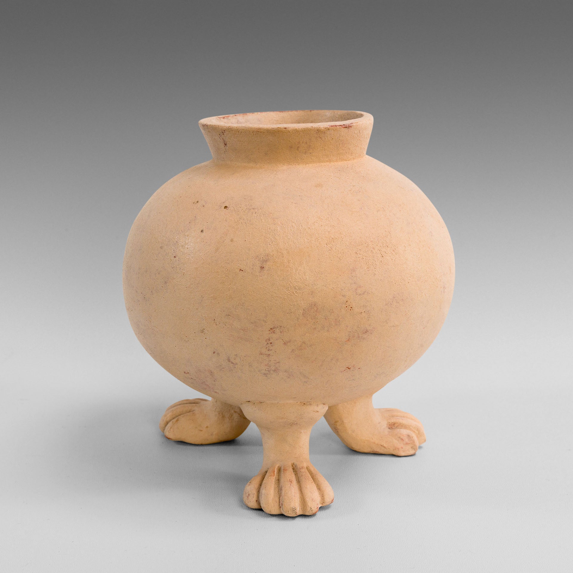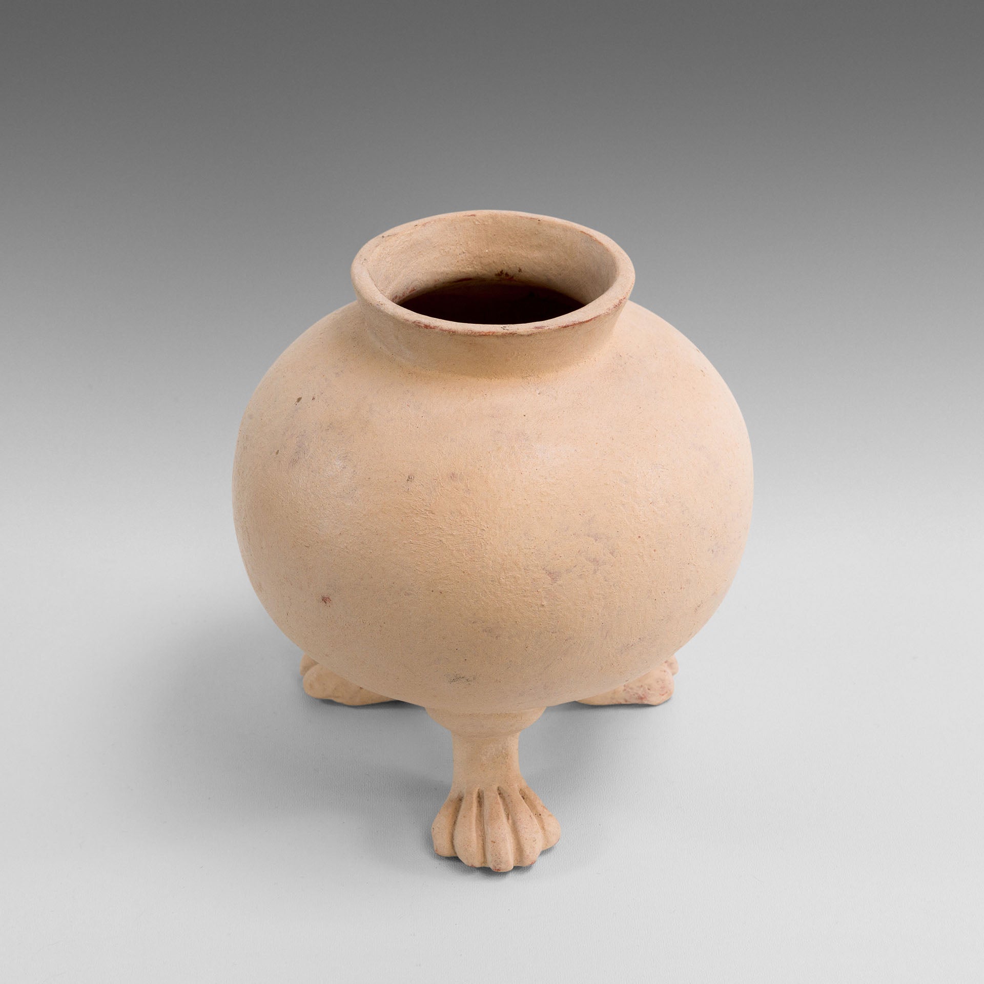 Le corps globuleux à trois pieds en forme de pattes d’animaux imite un type de vase chinois en bronze appelé fu. Cette forme n’a pas été trouvée parmi d’autres exemples de grès émaillé vert connu sous le nom d’articles Yüeh, mais à en juger par la forme, l’émail et les techniques d’enrobage utilisées, on suppose que le pot a été produit dans un four d’articles Yüeh en Chine dans le huitième siècle. Sa glaçure sombre a acquis une teinte irisée en raison d’un long enfouissement. Sur la base brun foncé non émaillée, un certain nombre de marques d’éperons indiquent où le navire était soutenu pendant le tir. L’un des trois pieds a été endommagé et a été réparé.