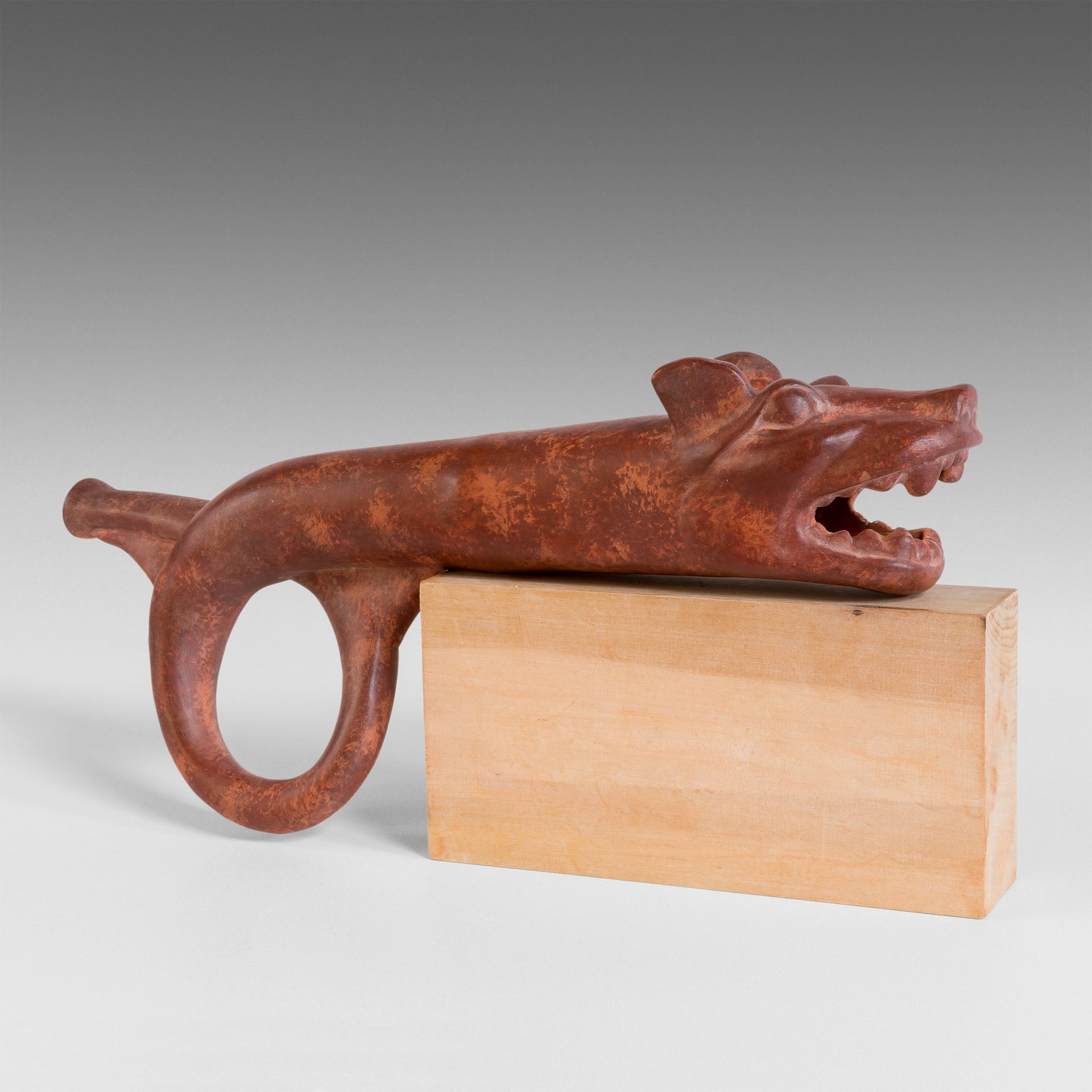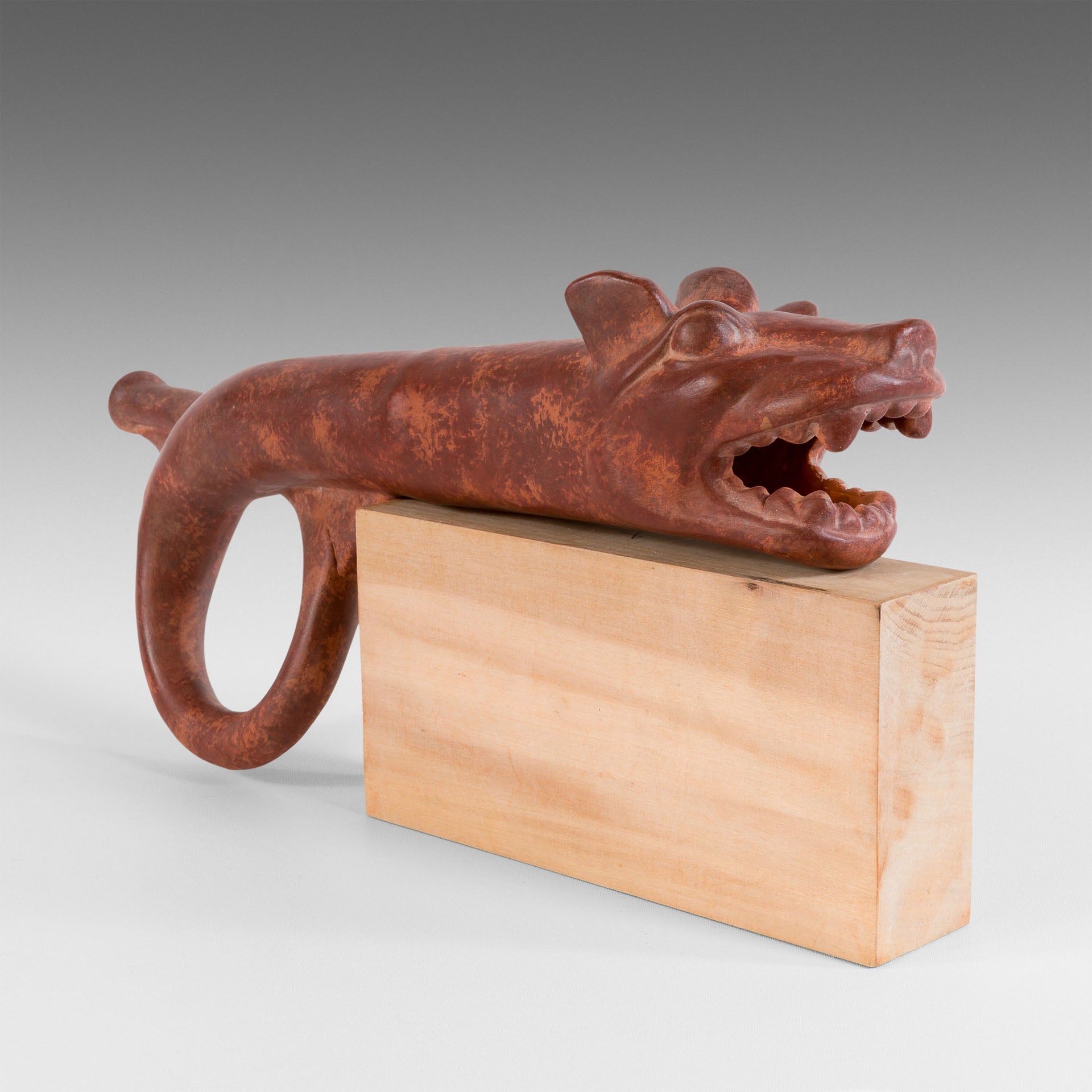 Cette trompette en terre cuite à engobe brun-rouge est constituée pour le pavillon d’une tête de félin à la gueule entrouverte et aux crocs menaçants, d’un corps allongé et serpentiforme se terminant par l’embouchure.