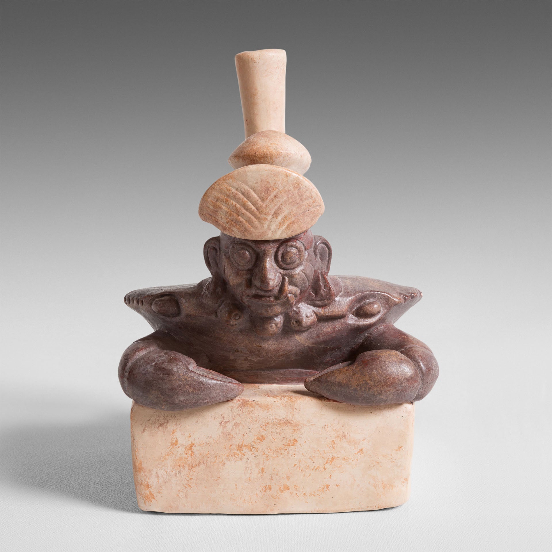 Ce vase étrier précolombien représente un crabe à tête humaine ou divine. Muni d'une coiffe, ce personnage a également un collier sur lequel sont disposées 3 visages souriants.