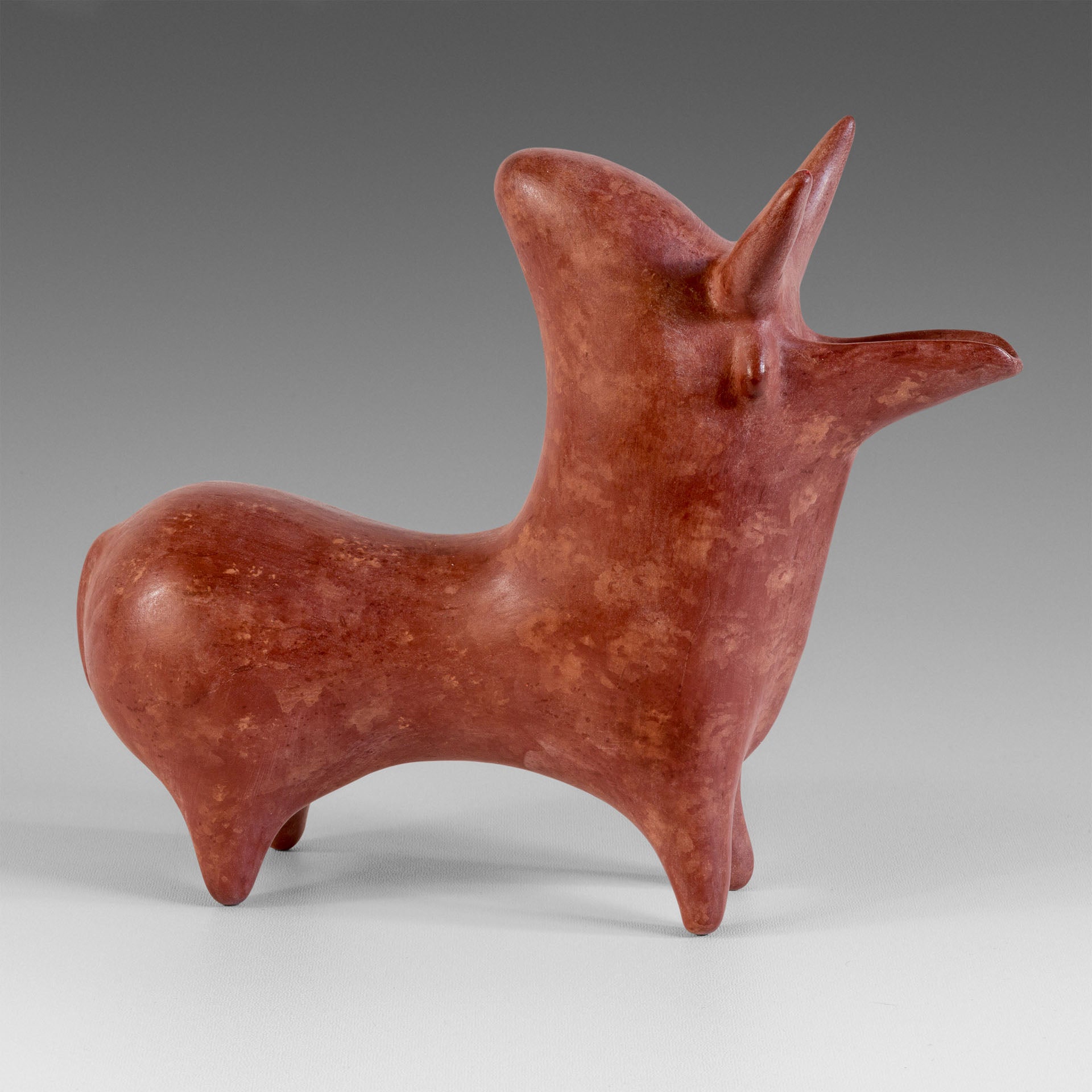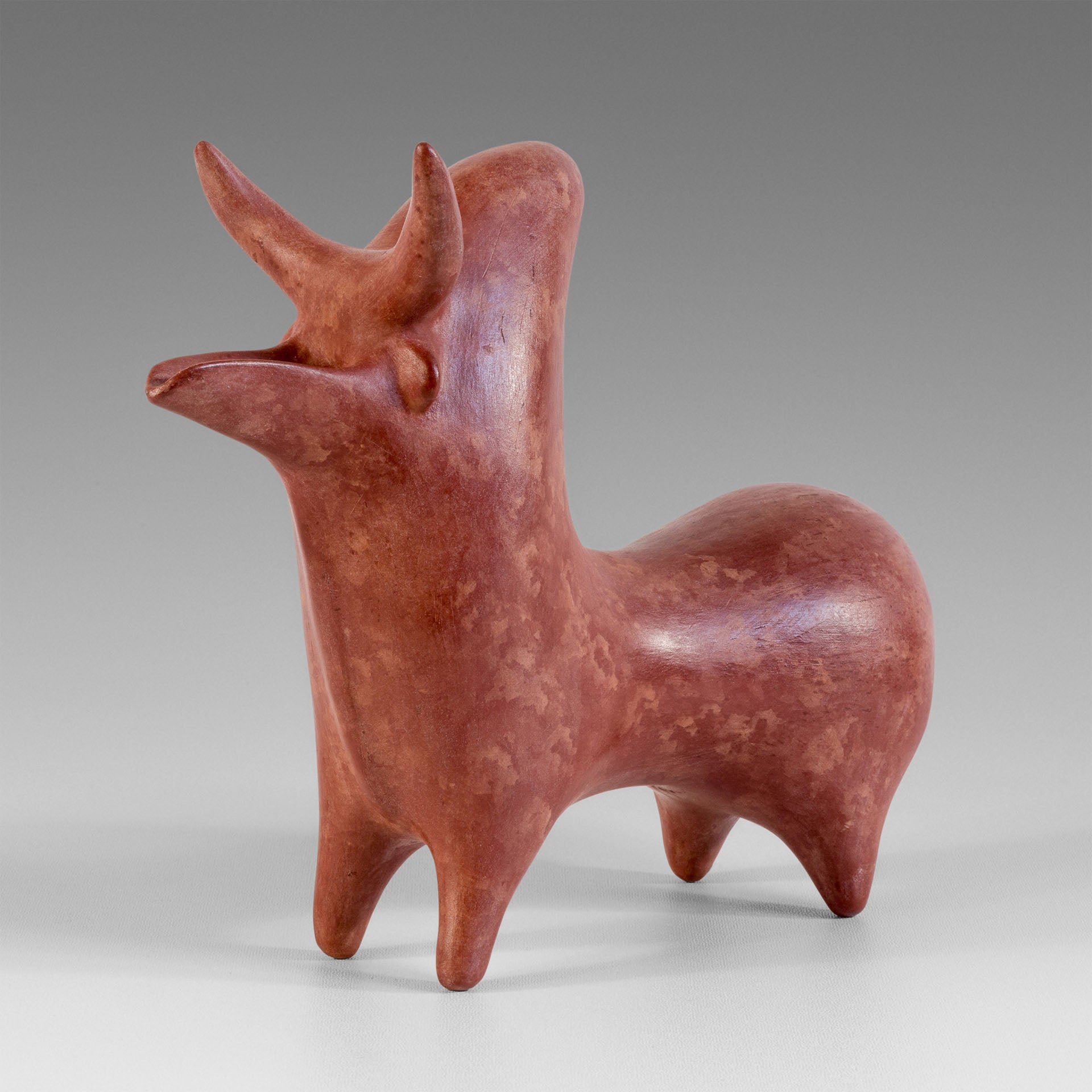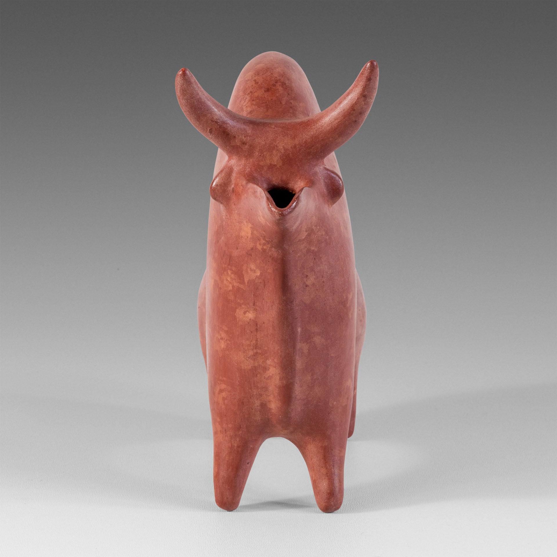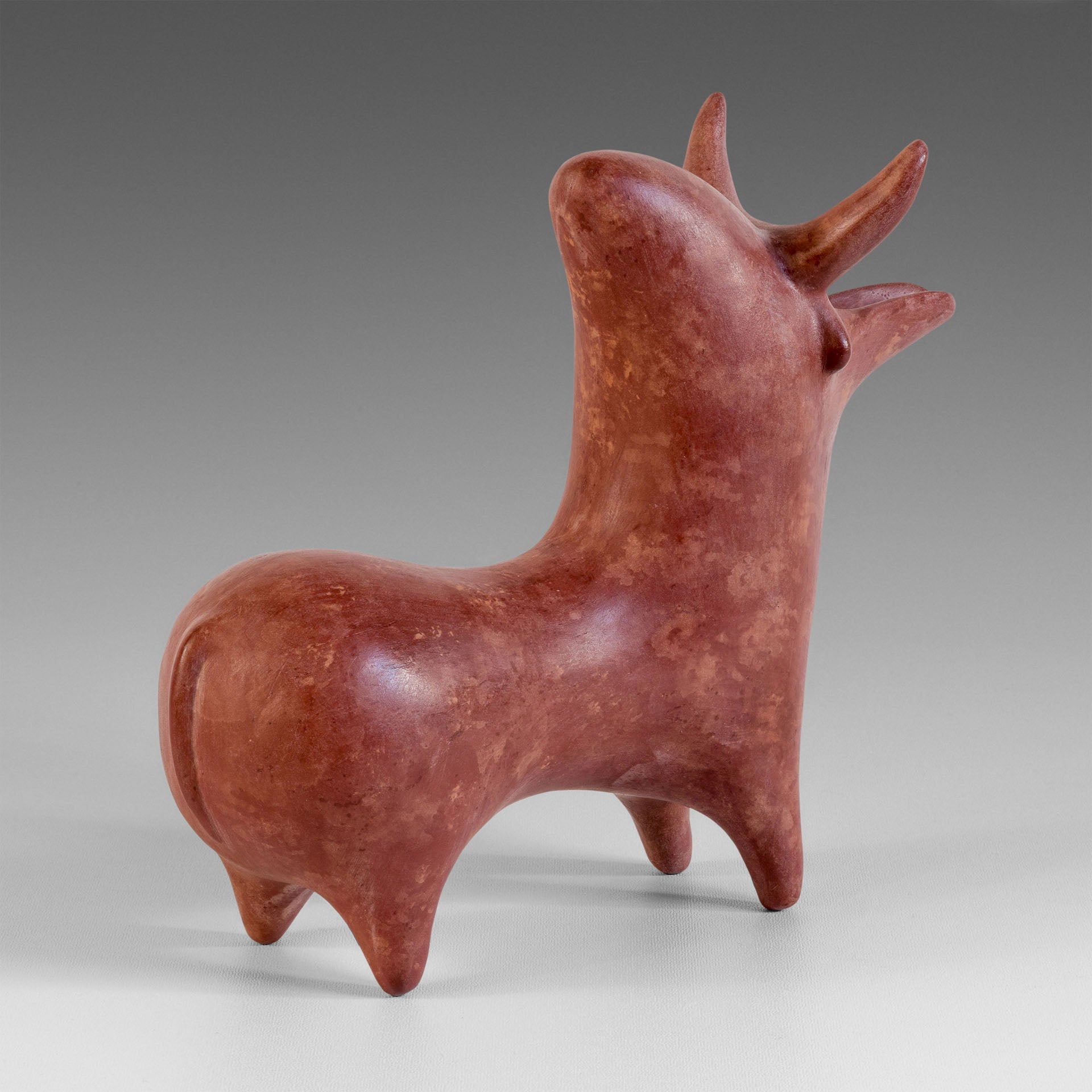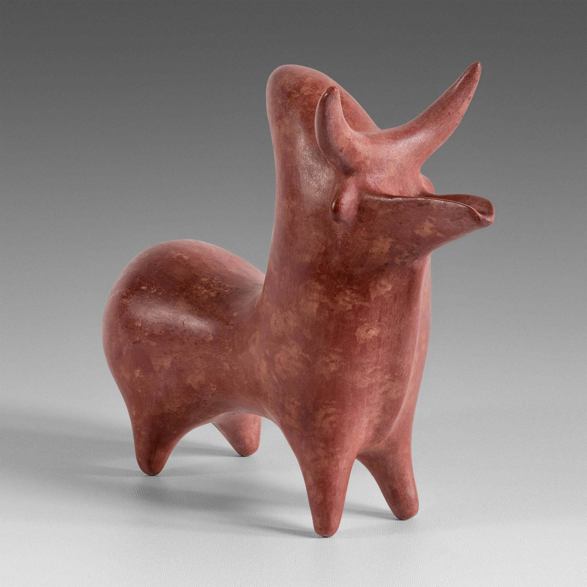Cette céramique lustrée représentant un zébu est le témoin d’un développement original, spécifiquement autochtone, la civilisation de Marlik, nom d’une vallée au nord de l’Iran près de la mer Caspienne. Avec ses traditions pastorales, ces peuplades ont produit une vaisselle en bronze, en or et en terre cuite remarquable. L’inspiration des formes est issue essentiellement du monde animal, mais quelques pièces de forme anthropomorphe et des associations homme animal nous sont parvenues. Ce taureau avec sa bosse très caractéristique derrière la tête et sa couleur rouge lustré est un exemple des nombreuses céramiques. C’était sans doute un récipient rituel.